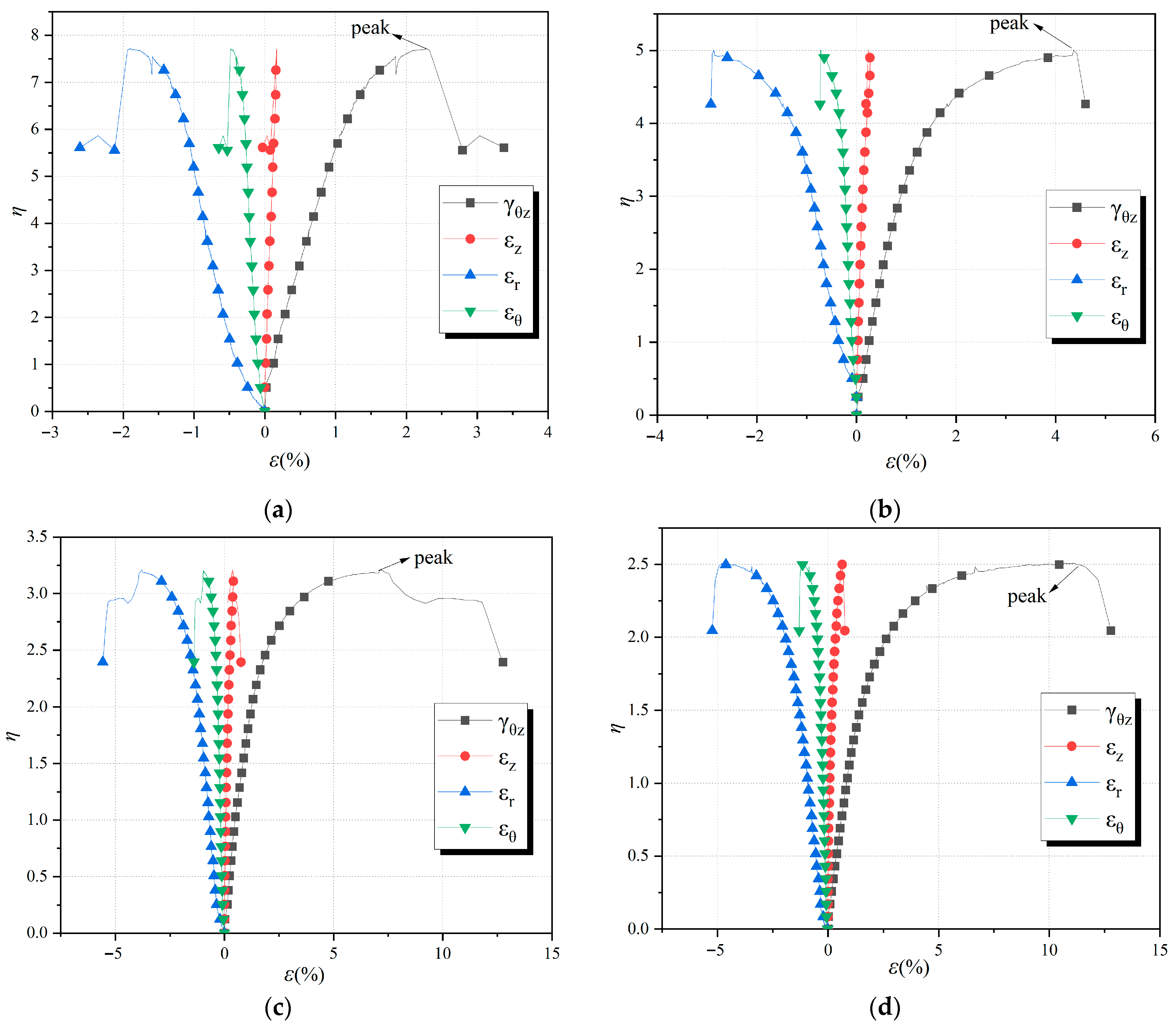 This strain trajectory culminates at a critical stress ratio (ηpeak), where a marked kinematic instability occurs. This instability is characterized by a sudden surge in γθz and |εr|, often coinciding with the visual observation of strain localization. We define this inflection point, which corresponds to the peak deviatoric stress, as the ultimate failure state of the specimen.