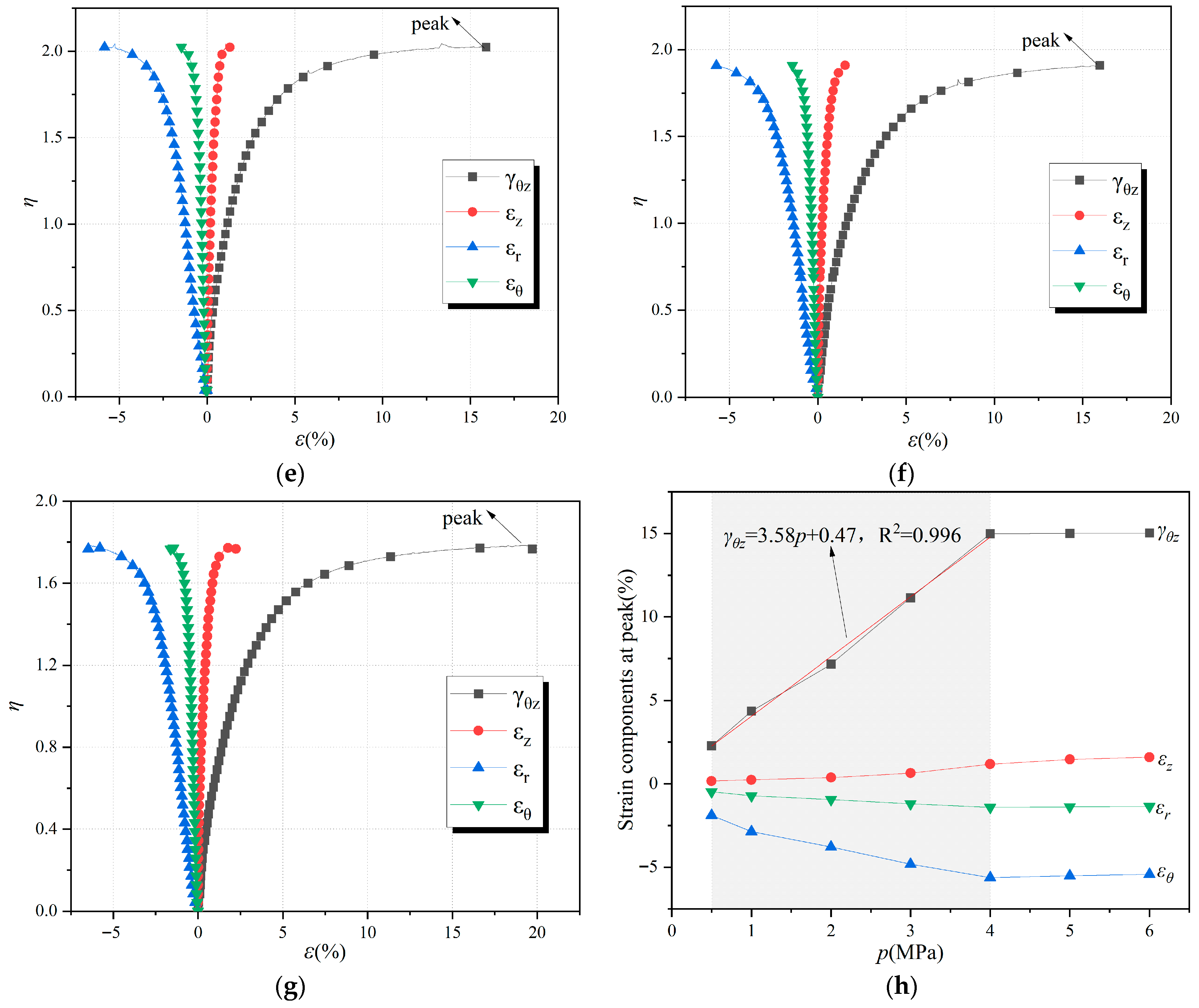 A consistent kinematic pattern emerges across all stress levels. At low stress ratios (η < 0.5), all strain components increase quasi-linearly and reversibly, dominated by the elastic distortion of the soil–ice composite. As η increases, the strain paths diverge, signaling the onset of dominant, irreversible plastic processes. The torsional shear strain (γθz) undergoes the most pronounced acceleration, unequivocally establishing itself as the primary deformation mode under this specific stress path (α = 30°). This is accompanied by a significant and progressive development of compressive radial strain (εr). In contrast, the axial (εz) and tangential (εθ) strains remain comparatively modest.