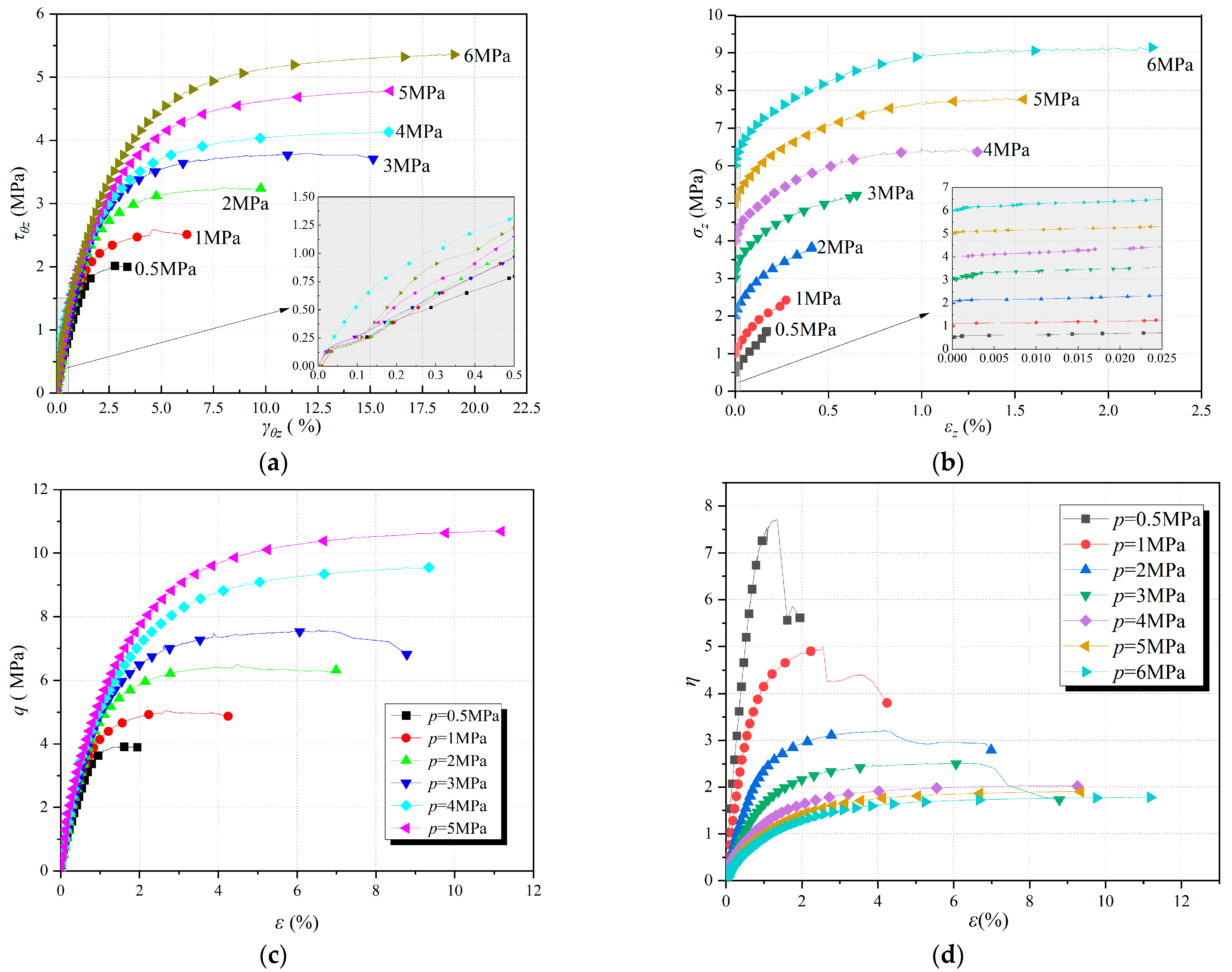 The component-specific and holistic stress–strain relationships provide critical insights into the deformation and failure mechanisms of pressurized frozen sand, revealing a pronounced dependence on the mean principal stress (p).