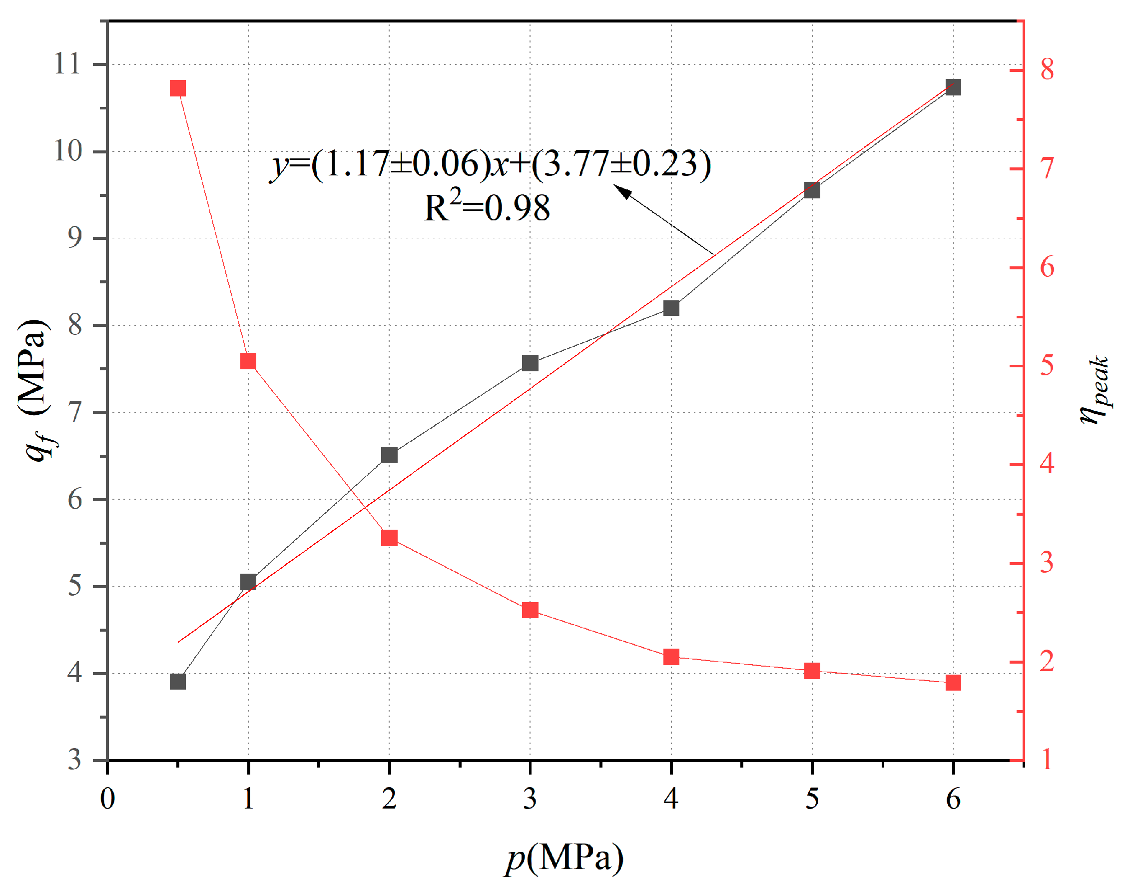 qf) exhibits a remarkably strong linear correlation with the mean principal stress across the entire tested range (0.5–6 MPa). A least-squares regression yields the following failure criterion: