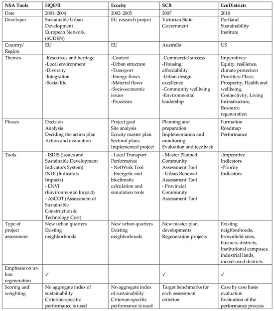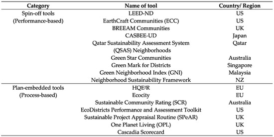 Some of the well-known neighborhood sustainability assessment (NSA) tools (adapted from [39,72]).