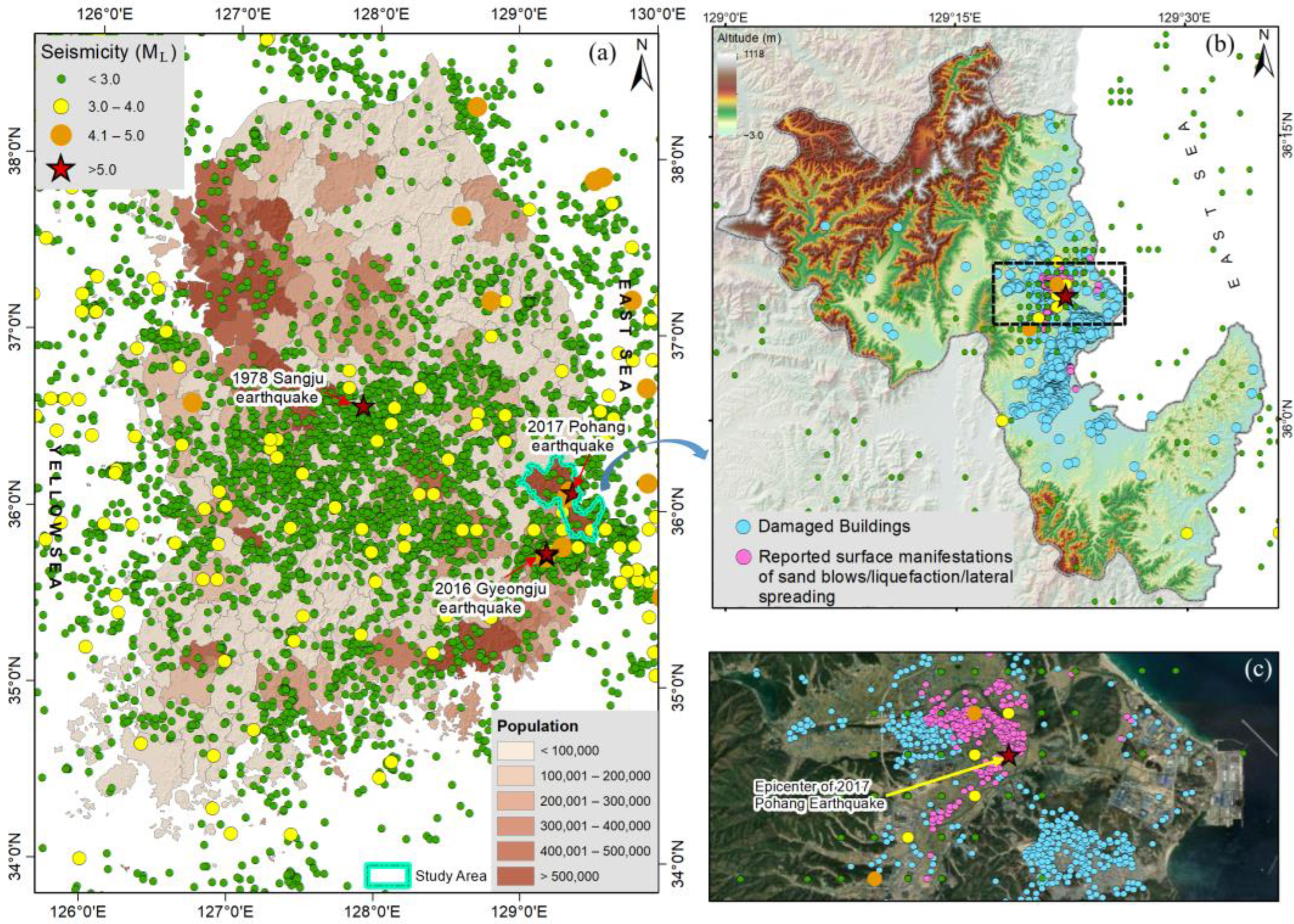 - Naik, S.P.; Gwon, O.; Park, K.; Kim, Y.S. Land damage mapping and liquefaction potential analysis of soils from the epicentral region of 2017 Pohang Mw 5.4 earthquake, South Korea. Sustainability 2020, 12, 1234. [Google Scholar] [CrossRef]