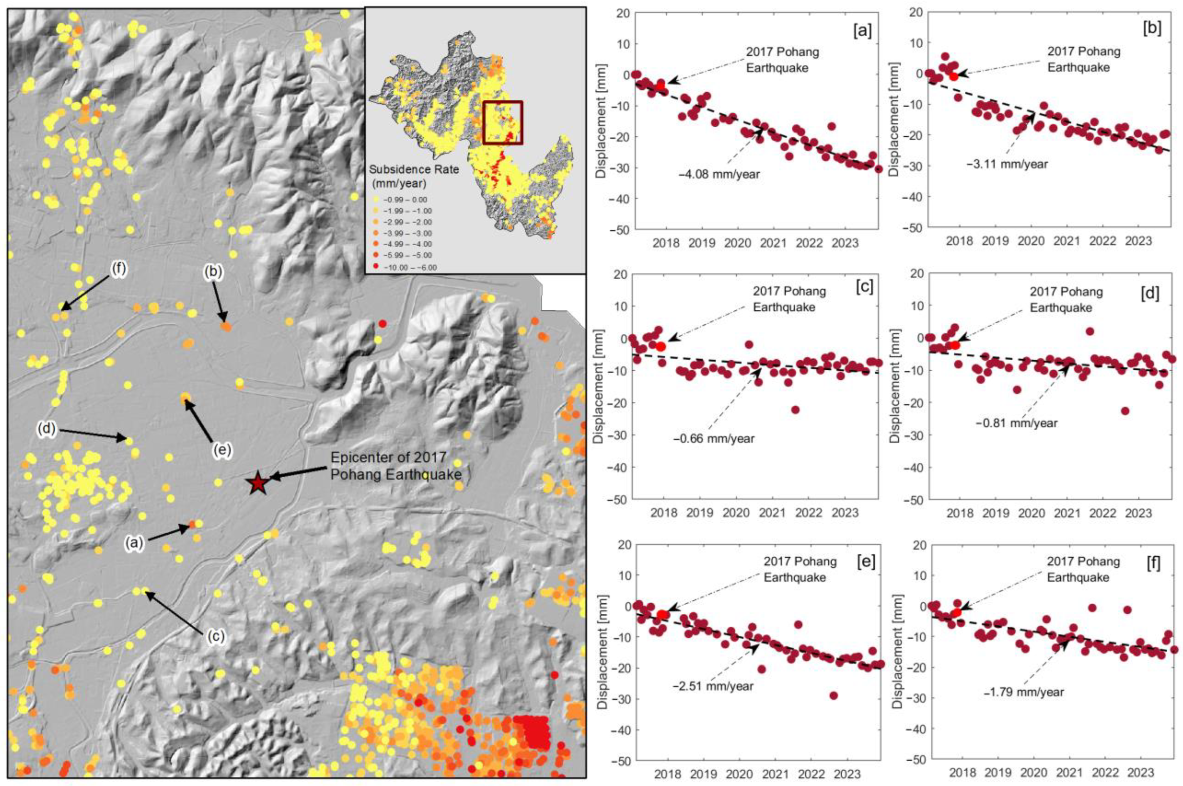 - Kang, S.; Kim, B.; Bae, S.; Lee, H.; Kim, M. Earthquake-induced ground deformations in the low-seismicity region: A case of the 2017 M5. 4 Pohang, South Korea, earthquake. Earthq. Spectra 2019, 35, 1235–1260. [Google Scholar] [CrossRef]