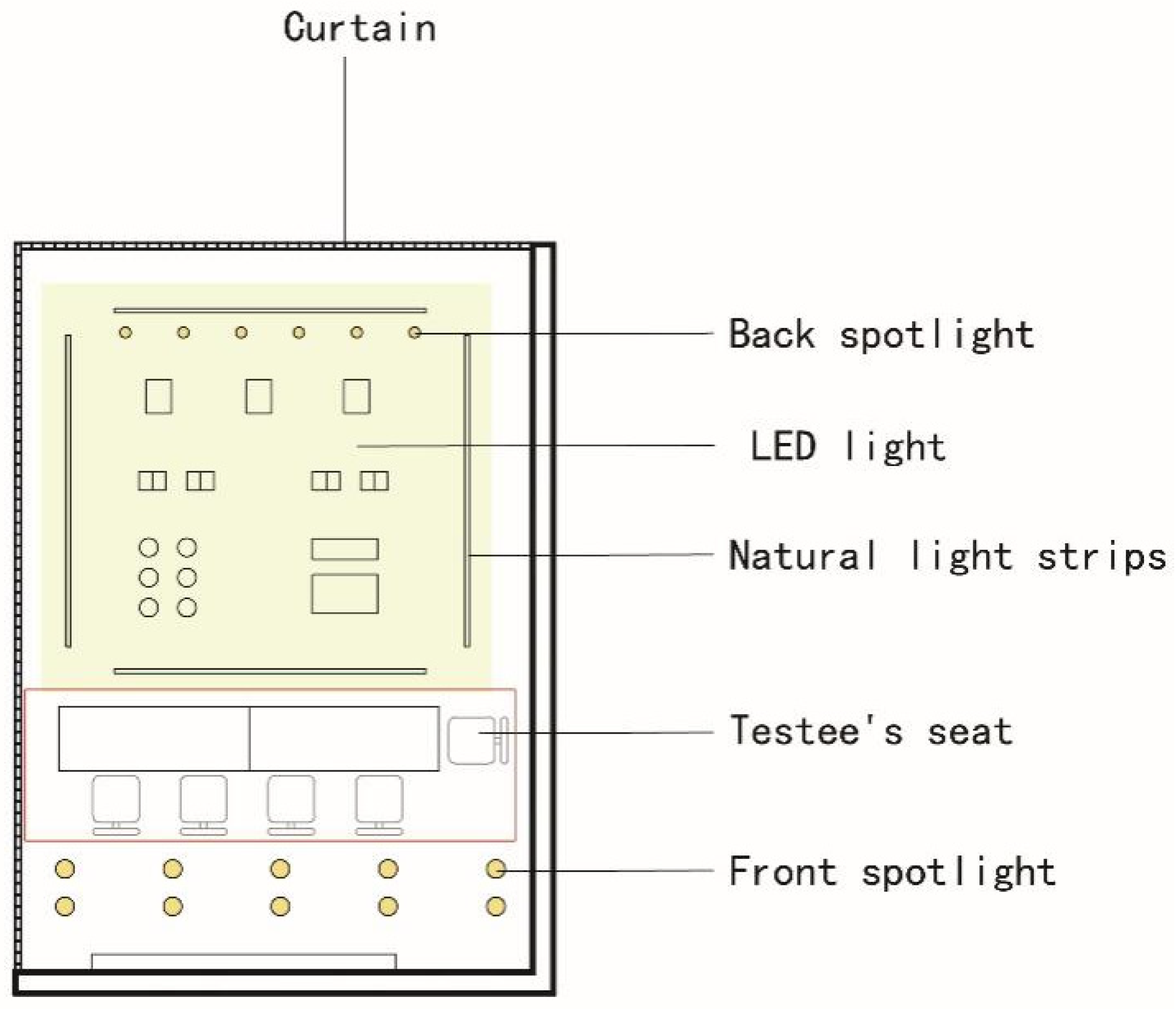 A heating device was placed in the corner of the laboratory to maintain suitable physical environmental parameters, such as temperature, humidity, and color rendering index, to prevent interference from other indoor environmental factors affecting the experimental lighting conditions. To eliminate the influence of natural light, which is difficult to control and has complex components, an opaque blackout curtain was used to block out external light interference. The layout of the Light and Color Laboratory is shown in
