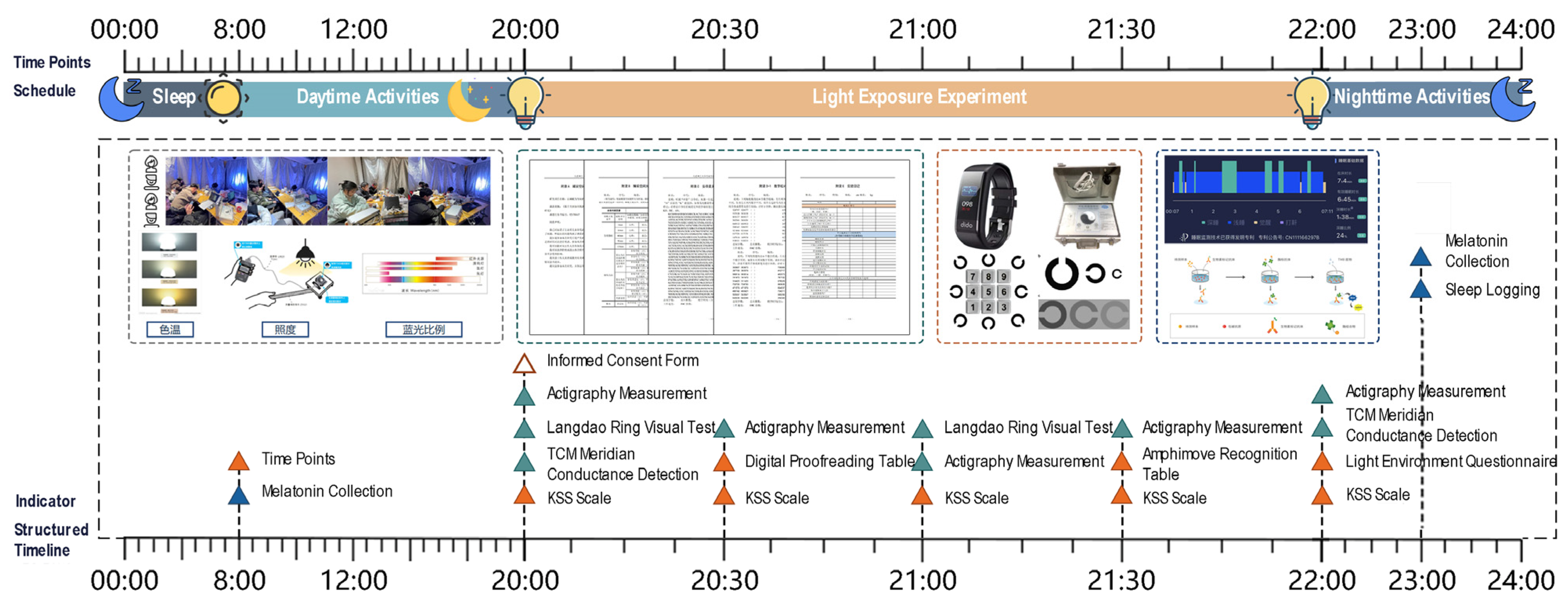 Under lighting conditions meeting visual efficiency and photobiological safety, a mixed model and full factorial design were applied to evaluate changes in subjective alertness, cognitive performance, mental fatigue, sleep score, and melatonin secretion. Nonparametric and correlation analyses were then performed to identify significant trends, providing a quantitative basis for establishing relationships between lighting environments and human responses, and for developing the rhythmic lighting design framework.