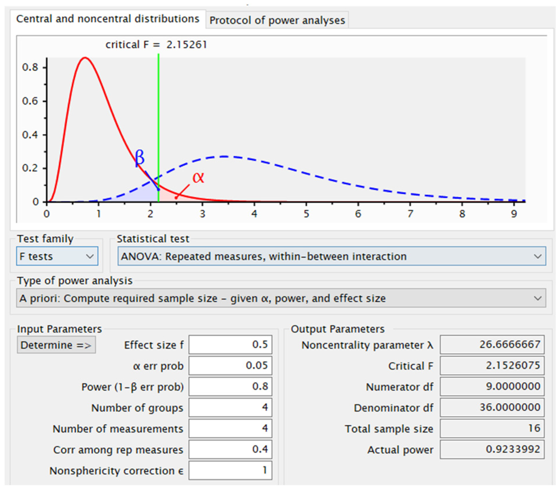 The sample size was statistically determined using G*Power version 3.1.9.7, with the statistical power set at 0.8 and a significance level of α = 0.05, following standardized protocols for behavioral and environmental studies. The calculation process involved specifying the experimental design and statistical model, selecting a one- or two-tailed test based on the research objectives, and determining the expected effect size from either a pilot experiment or from the previous literature [