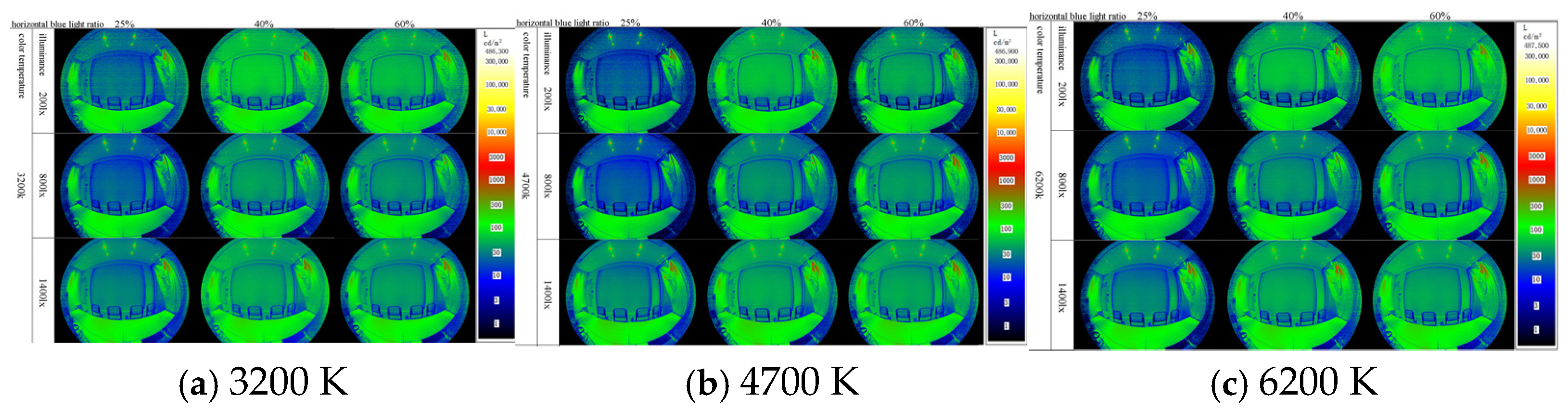 35]; therefore, in this experiment, horizontal illuminance at a desk height of 0.7 m was used as the reference standard, with additional measurements taken for vertical illuminance levels at a standing eye height of 1.2 m above the ground.