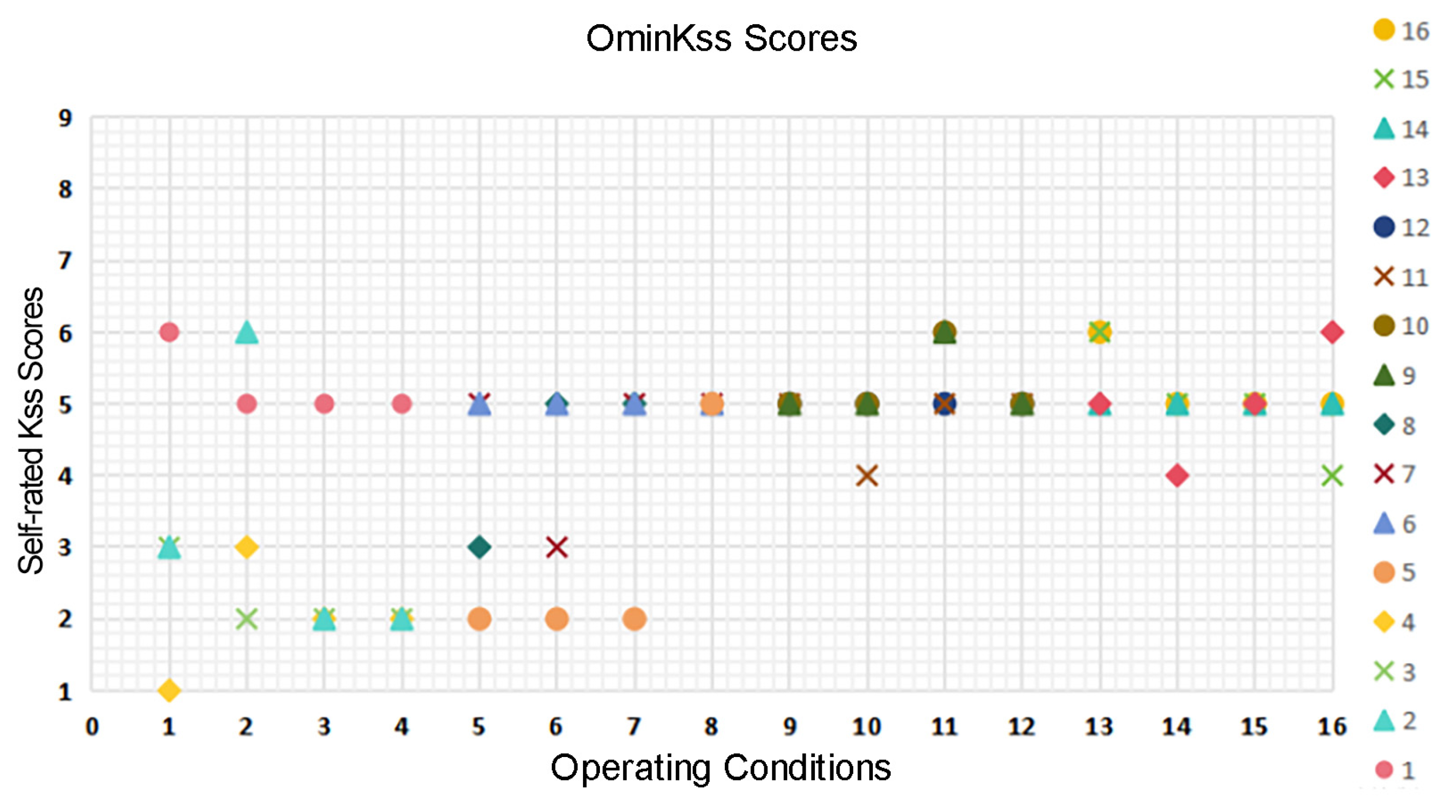 Figure 11, the statistical evaluation of participants’ fatigue levels under different working conditions indicated that all participants rated their KSS scores between 2 and 5 before each working condition, reflecting a neutral to slightly positive state.