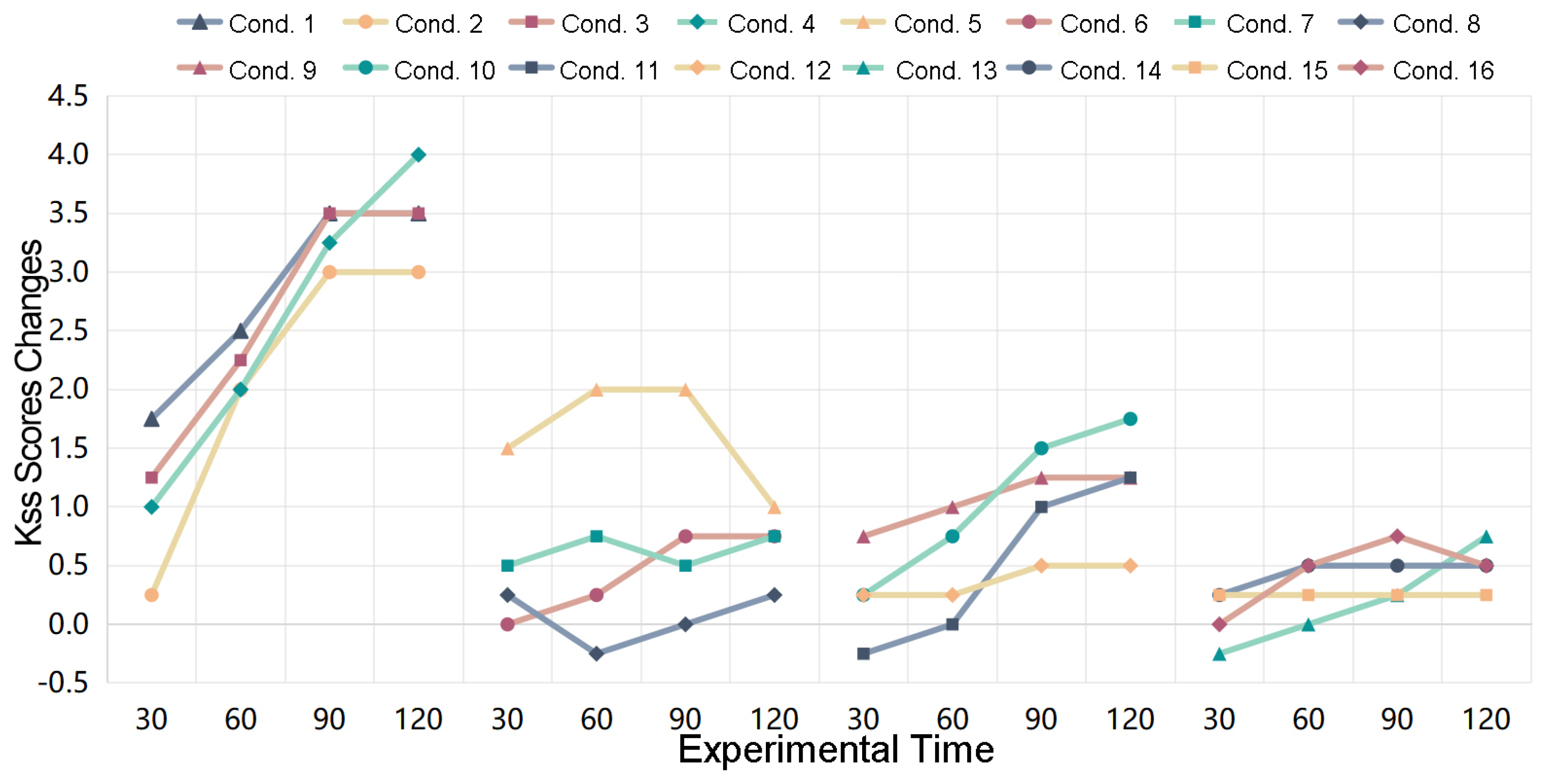 Figure 12 shows that under warm color temperature (3200 K) conditions, the mean change in KSS scores for working conditions 1–4 increased by more than three after the experiment compared to before, with the change in drowsiness being the most significant. Additionally, drowsiness levels continuously increased from 0 to 90 min into the experiment, stabilizing after 90 min. Under the same illuminance and horizontal blue light ratio, the changes in drowsiness levels under warm color temperature (3200 K) were also quite pronounced. Multiple comparisons of the changes in KSS scores revealed that color temperature exerted the strongest influence on drowsiness levels, followed by illuminance and then the horizontal blue light ratio.