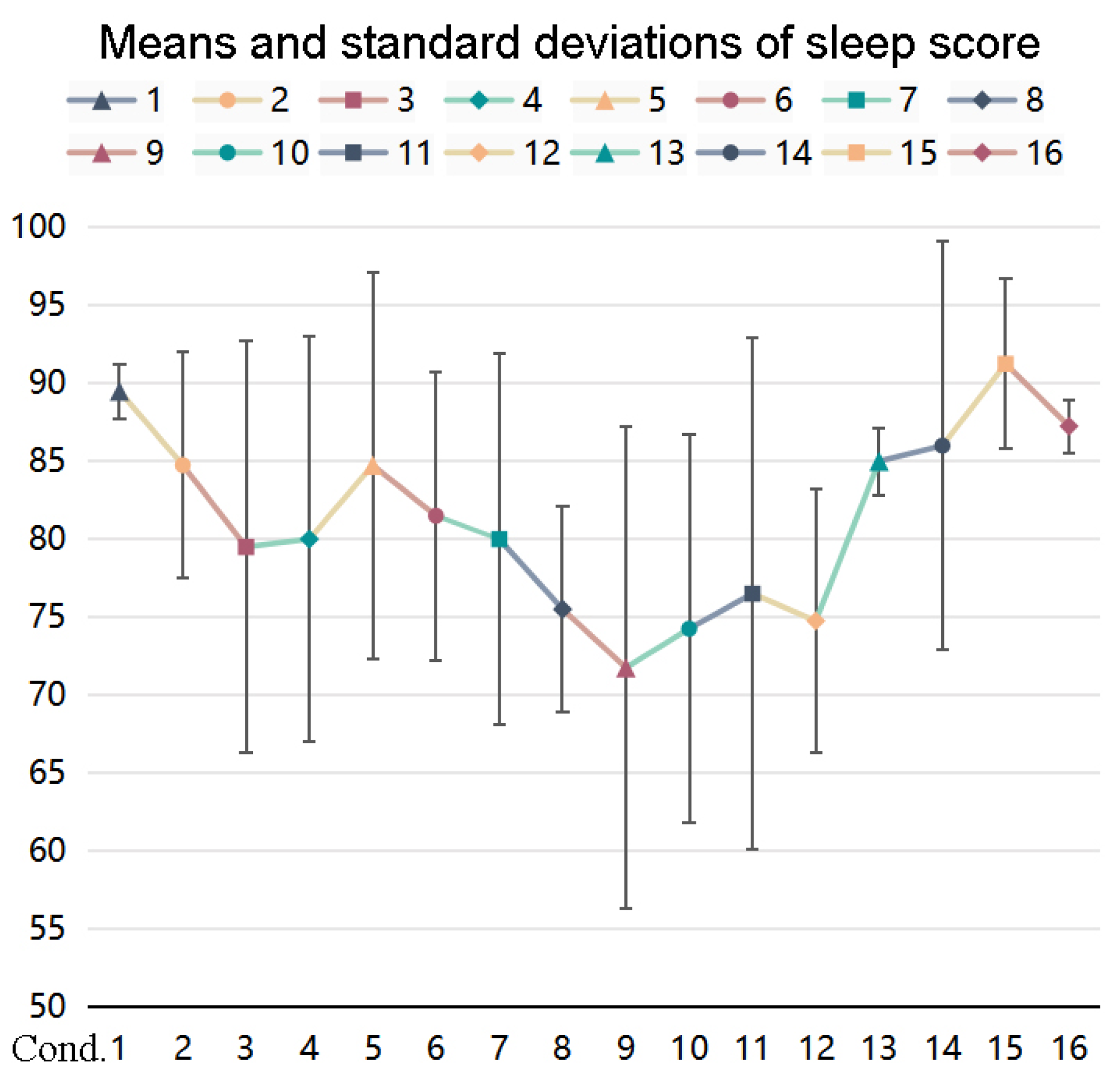 Sleep efficiency is defined as the ratio of effective sleep duration to the total time spent in bed, reflecting the proportion of wakefulness to sleep during this time. This indicator is commonly used to assess the risk of sleep disorders, with a normal sleep efficiency above 85%.The means and standard deviations of sleep efficiency evaluation under different conditions are as shown in