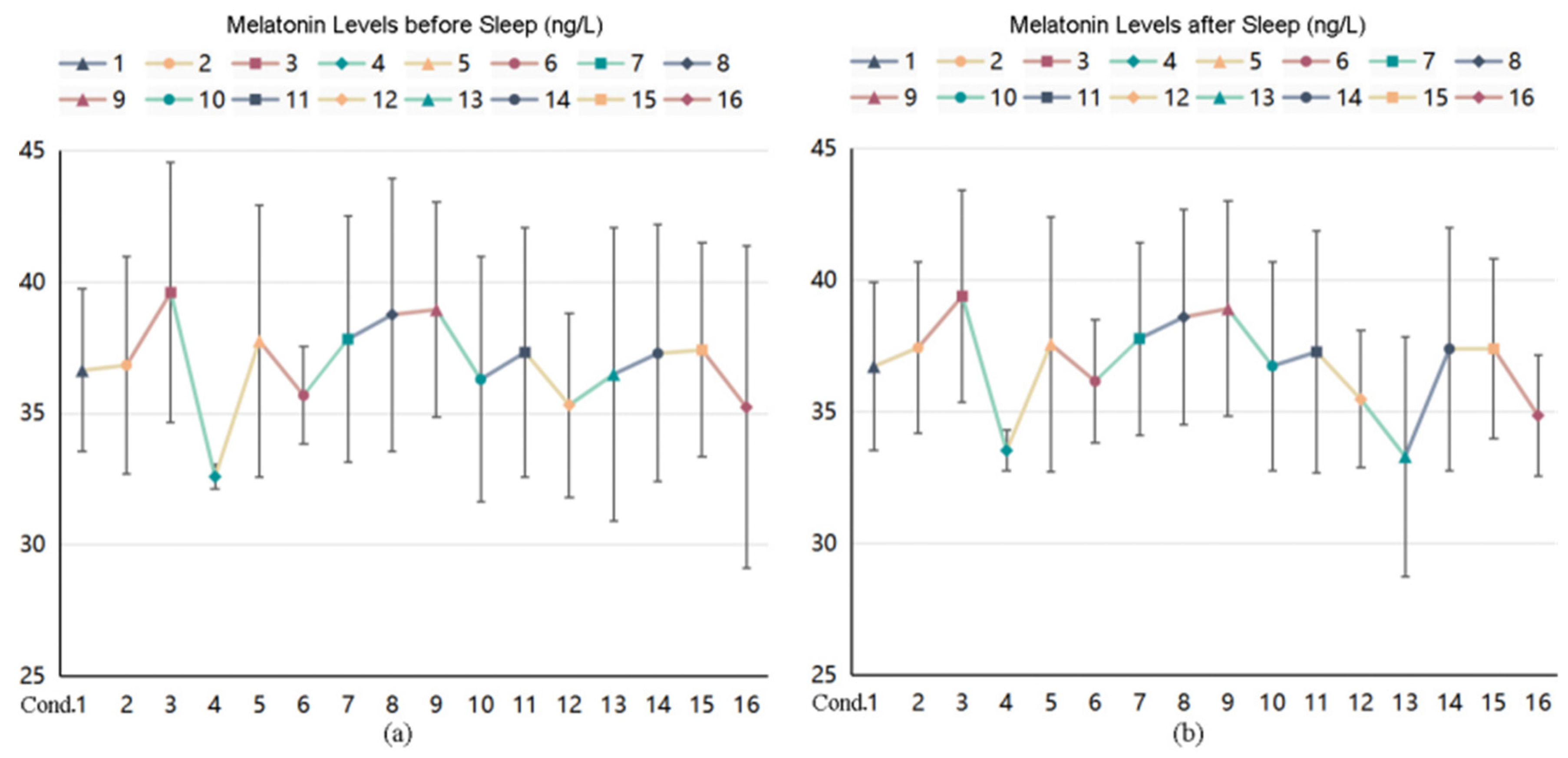 Figure 14. Except for condition 13, the experimental results indicate a similar trend in melatonin levels before and after sleep. Notably, due to the uniqueness of condition 13, the changes in melatonin levels show significant deviation from other data, and it can be regarded as an outlier.