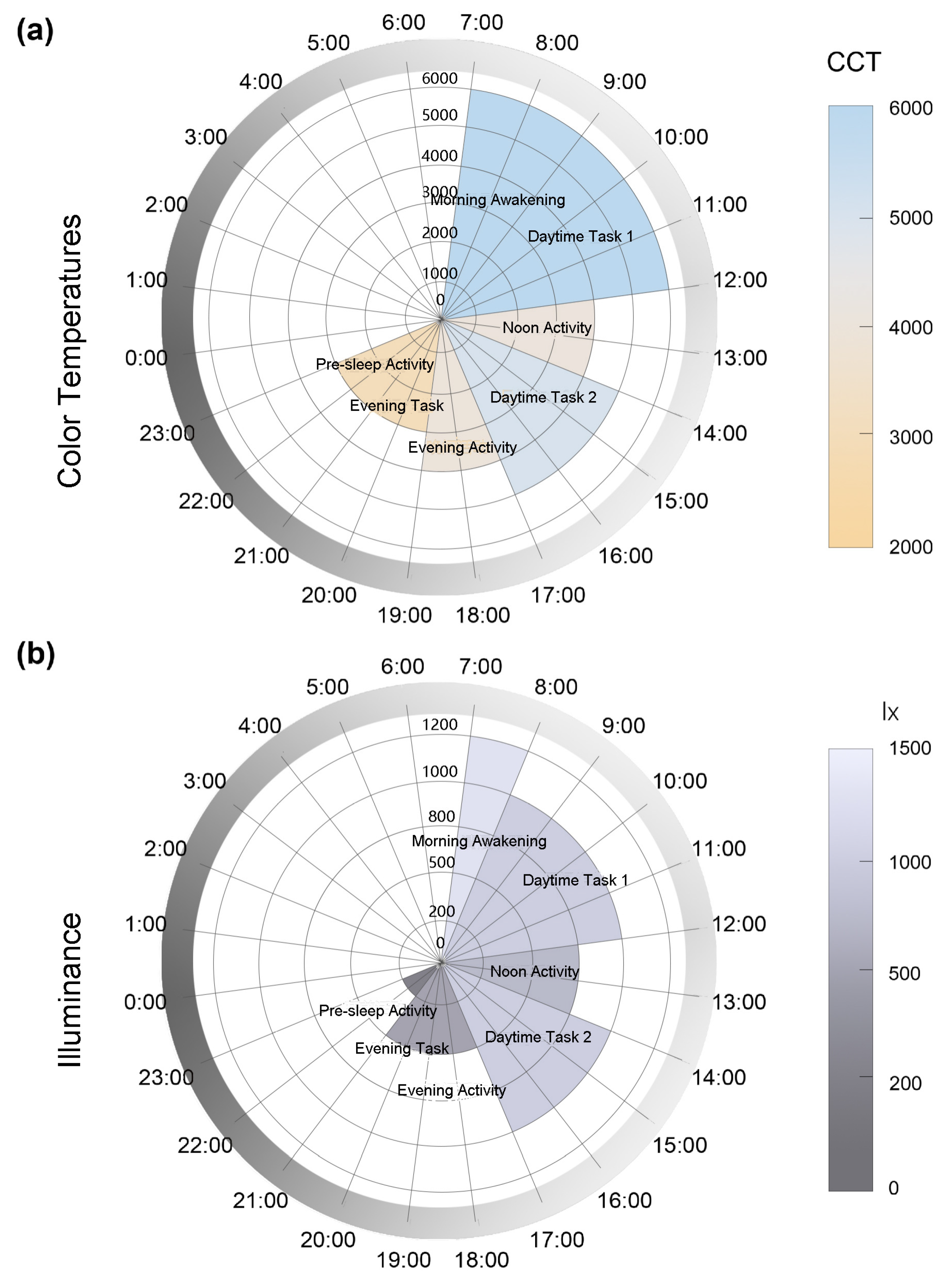 Figure 15, this approach is consistent with the CIE’s concept of “human-centered dynamic lighting,” which emphasizes adjusting illuminance and color temperature throughout the day to align with human circadian rhythms. This approach refers to the real-time adjustment and variation in illuminance or color temperature according to a predetermined pattern at different times of the day, to optimize and improve aiming to optimize and improve individuals’ physical and mental functions. This study applies dynamic lighting technology to design and implement a basic temporal rhythm lighting scheme based on the daily activity schedules of most people, taking into account various factors. The scheme includes eight lighting scene modules to address user issues related to daytime emotions, work efficiency, and sleep quality while enhancing cognitive performance. In practice, it has demonstrated specific effective results; however, adjustments must be made based on actual conditions during application.