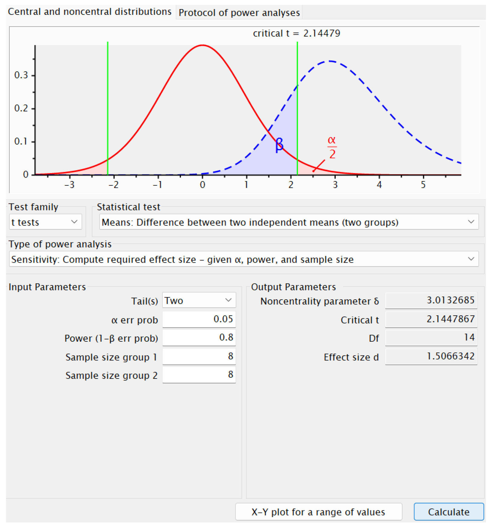 Figure 16, A post hoc sensitivity power analysis (G*Power 3.1.9.7) showed that with eight participants per group (α = 0.05, power = 0.8), the study had sufficient power only to detect very large effects (Cohen’s d = 1.51), which substantially exceeds Cohen’s conventional threshold for a “large” effect (d = 0.8). As a result, while the significant large-effect findings are considered reliable, the study was likely underpowered to detect small-to-medium effects, and non-significant outcomes in these cases should be interpreted with caution. Therefore, future studies with larger and more diverse samples are needed to further validate and generalize the present results.