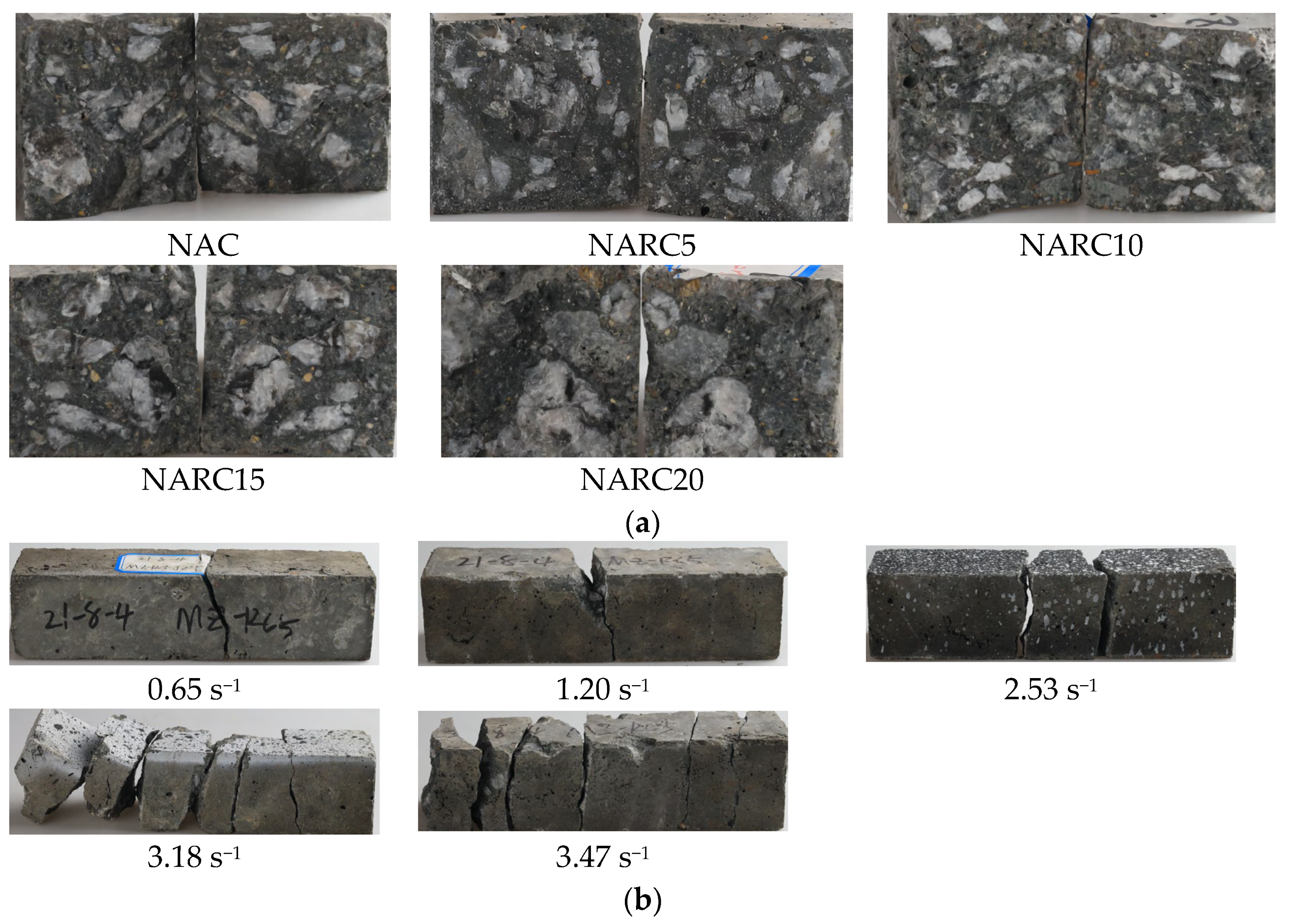 - Although rubber particles can reduce the fragility of NARC as a flexible material, they significantly decrease the strength of NARC and are not suitable for the excessive addition of rubber particles. As the rubber content increased from 0% to 20%, the dynamic flexural strength decreased significantly. The weak interfacial adhesion between rubber particles and the cement matrix acts as a microcrack nucleus, leading to reduced strength. For example, at a strain rate of 7.45 s−1, the dynamic flexural strength of NAC (0% rubber) was 139.50 MPa, while that of NARC20 (20% rubber) decreased to 74.72 MPa.