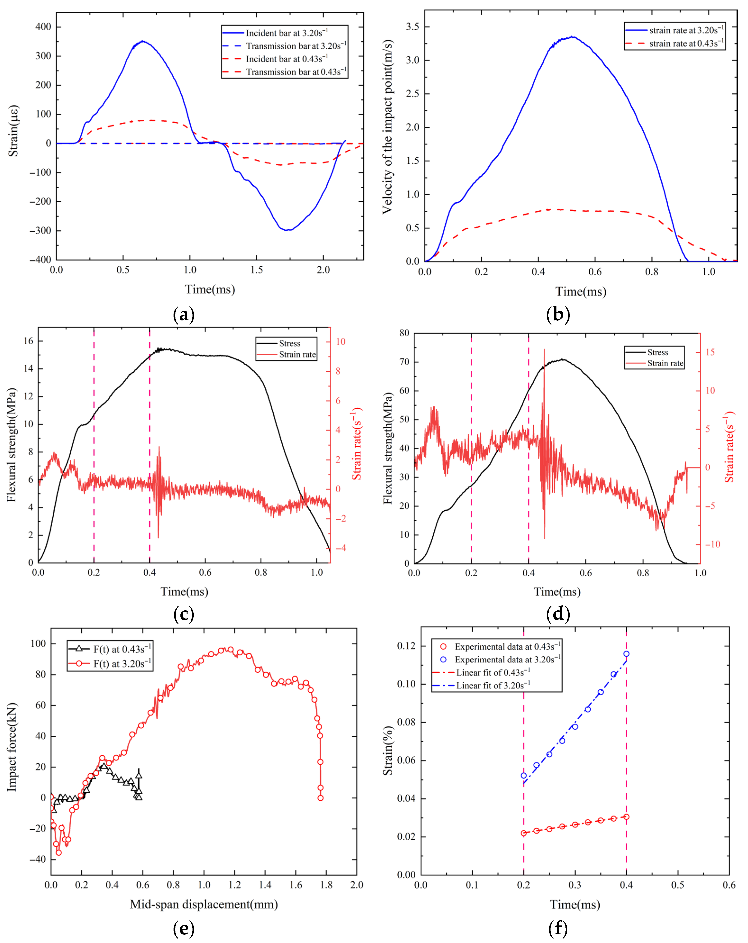 | Specimen | Quasi-Static Flexural Strength | Strain Rate (s−1) | Dynamic Flexural Strength (MPa) | DIF | Displacement (mm) |
