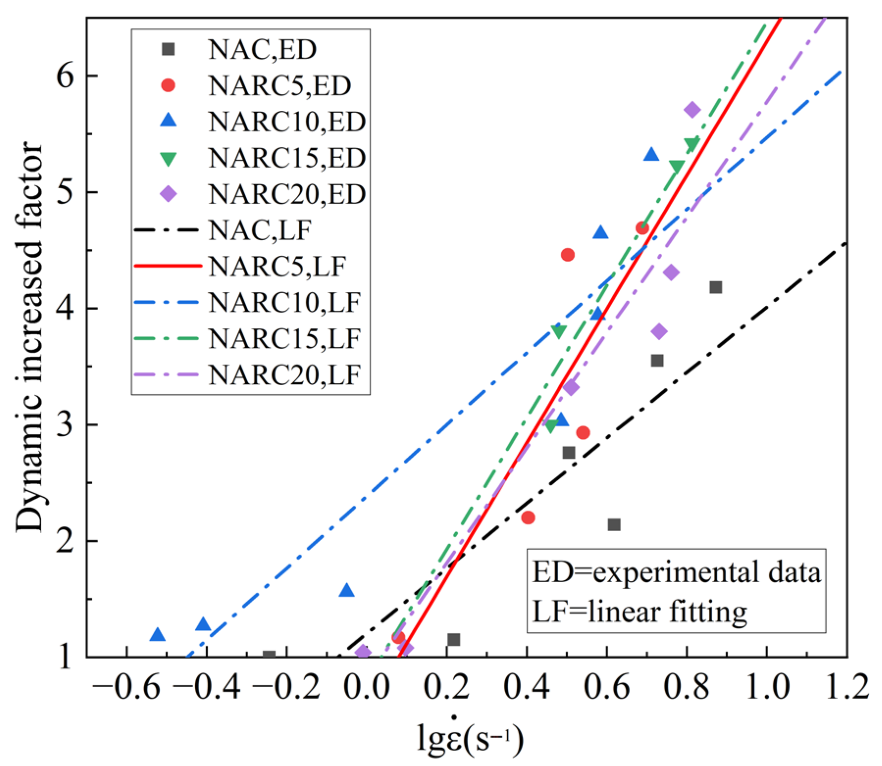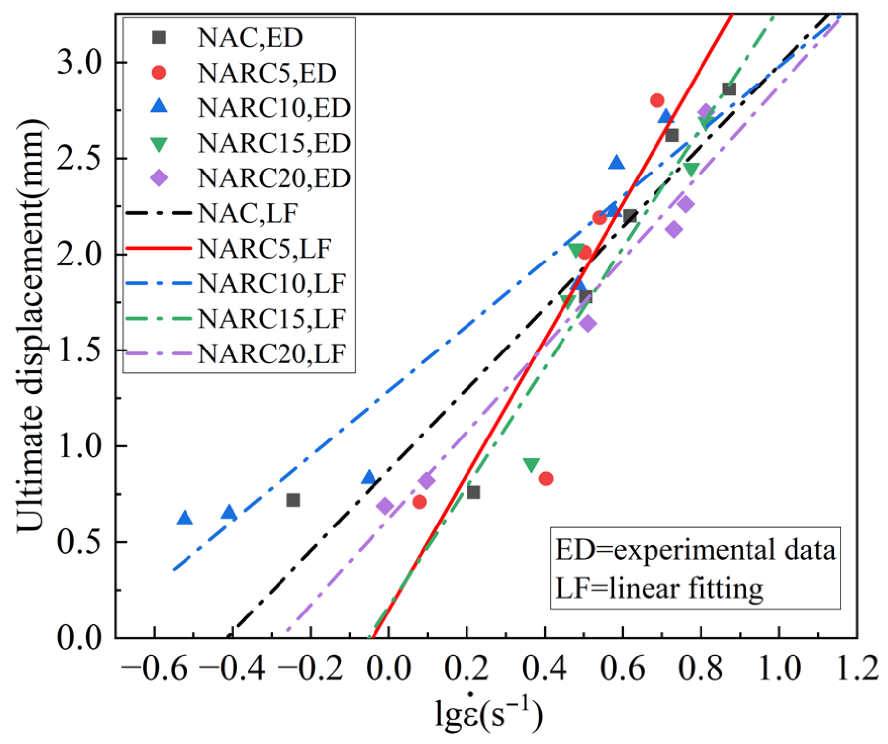 - Rubber particles dissipate impact energy, synergistically improving flexural strength and ultimate deformation. At a rubber replacement rate of 5%, the impact of strain rate on DIF becomes more pronounced, and the strain rate effect is also evident in the mid-span displacement during flexural tests. The mechanism is that at high strain rates, the large impact energy causes coarse aggregates to fracture rather than being bypassed, thereby enhancing flexural strength. As a flexible material, rubber particles positively enhance the NARC’s ultimate deformation capacity by dissipating part of the impact energy. At appropriate rubber content levels, they can improve the strain rate sensitivity of strength on NARC.