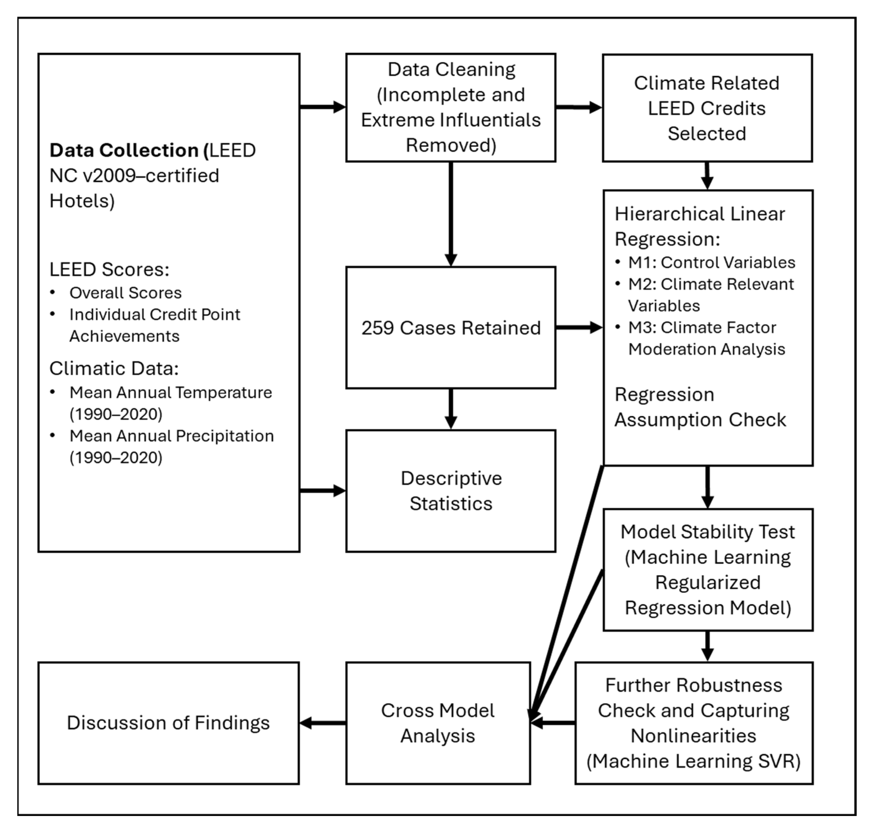 By integrating hierarchical regression with regularized and nonlinear machine-learning models, this study introduces a novel multi-method framework for examining climate-sensitive LEED credit performance, offering a more interpretable, stable, and generalizable approach than any single technique alone.