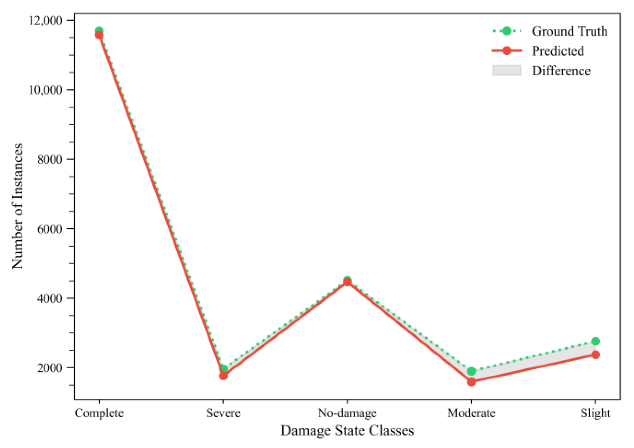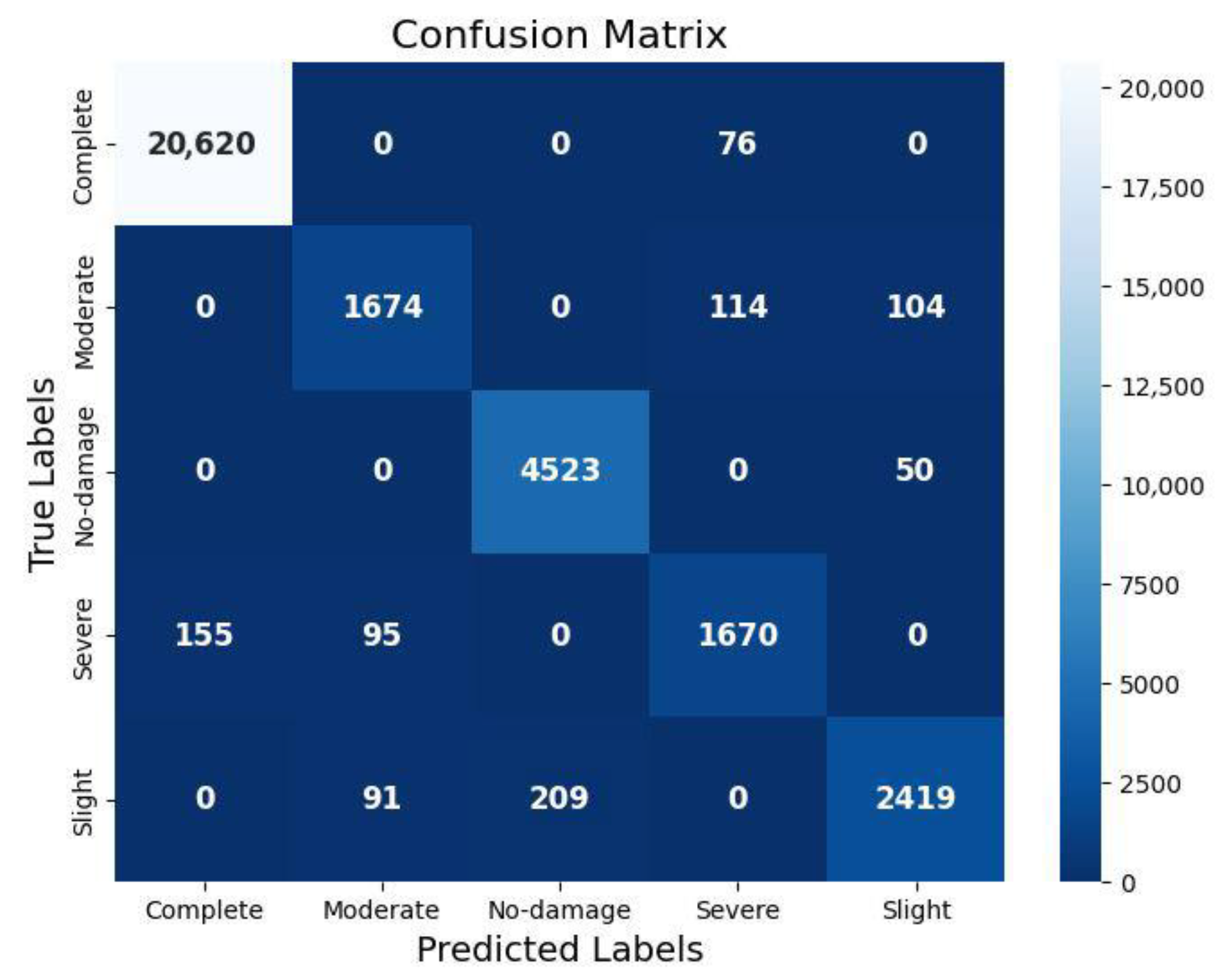 - The model was able to distinguish between damage classes (No-damage to Complete) effectively, though minor confusion was observed in borderline cases of the explicitly moderate vs. severe damage states.
