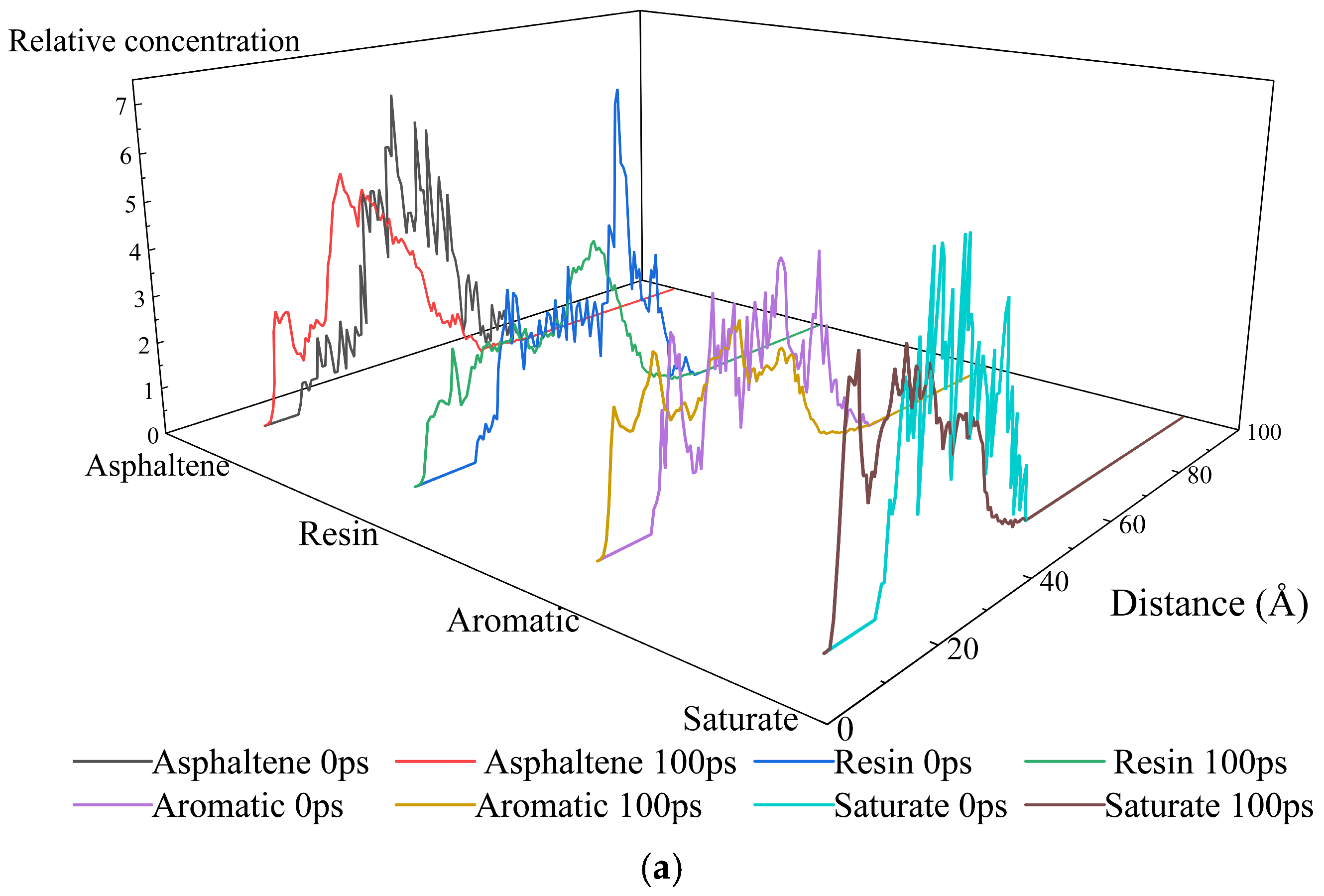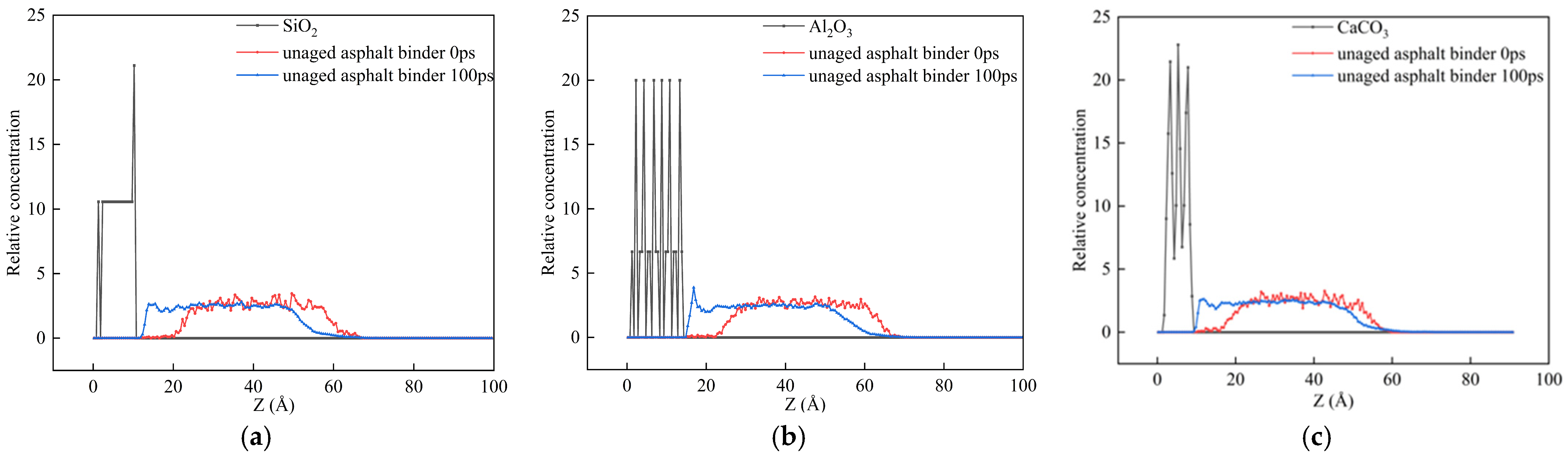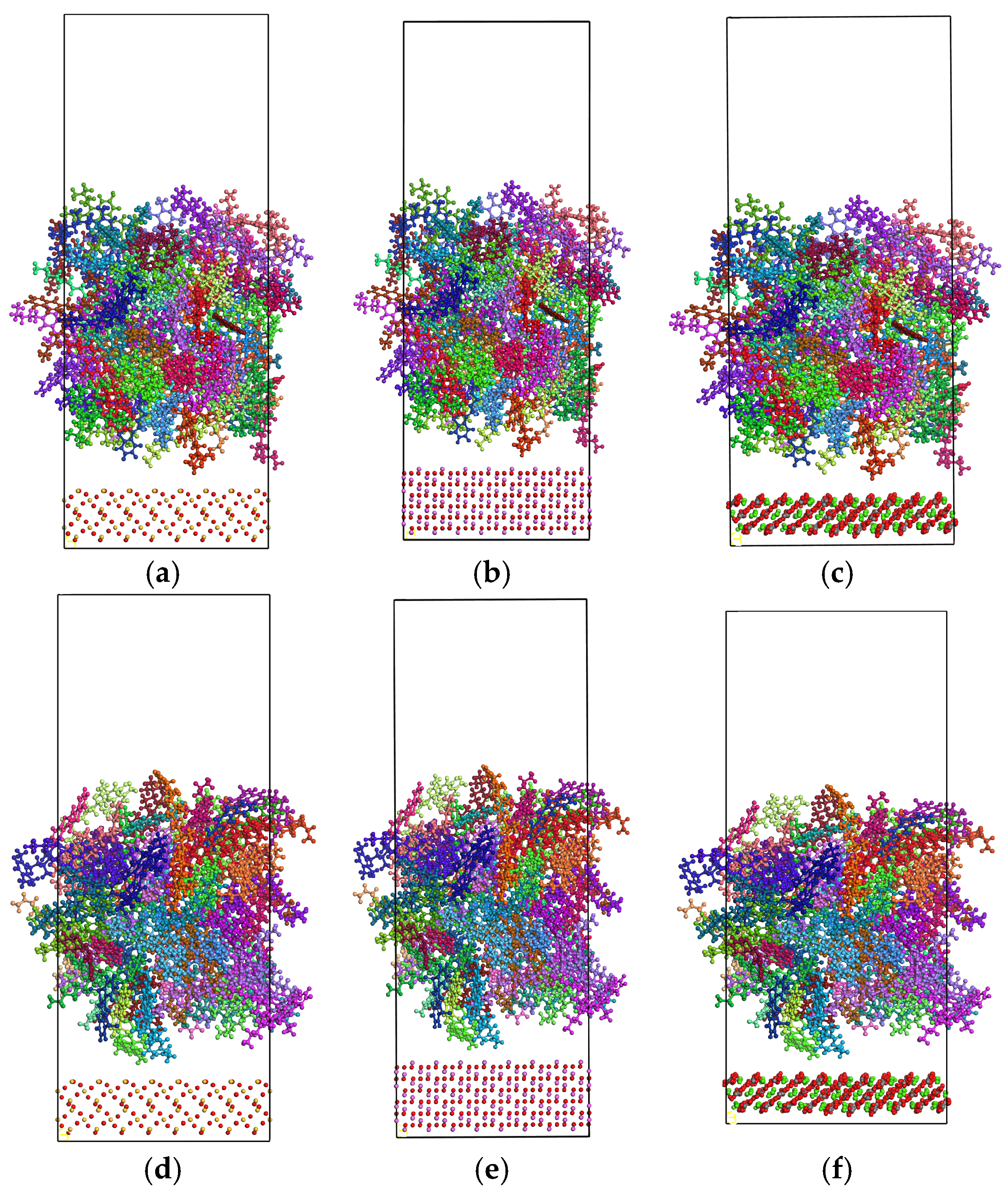 - Gao, Y.; Zhang, Y.; Yang, Y.; Zhang, J.; Gu, F. Molecular dynamics investigation of interfacial adhesion between oxidised bitumen and mineral surfaces. Appl. Surf. Sci. 2019, 479, 449–462. [Google Scholar] [CrossRef]