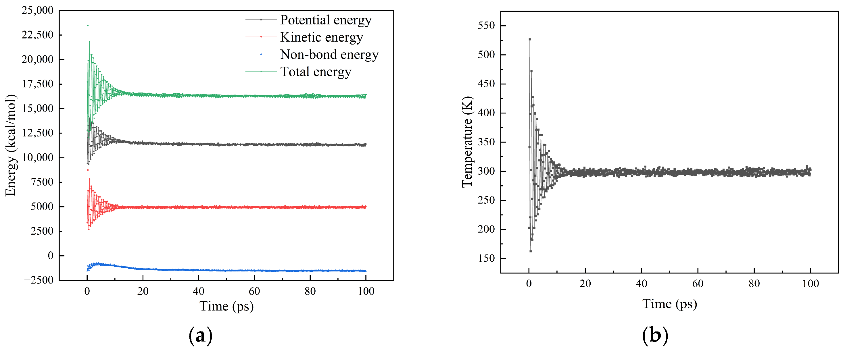 - Xu, Z.; Wang, Y.; Cao, J.; Chai, J.; Cao, C.; Si, Z.; Li, Y. Adhesion between asphalt molecules and acid aggregates under extreme temperature: A reaxff reactive molecular dynamics study. Constr. Build. Mater. 2021, 285, 122882. [Google Scholar] [CrossRef]