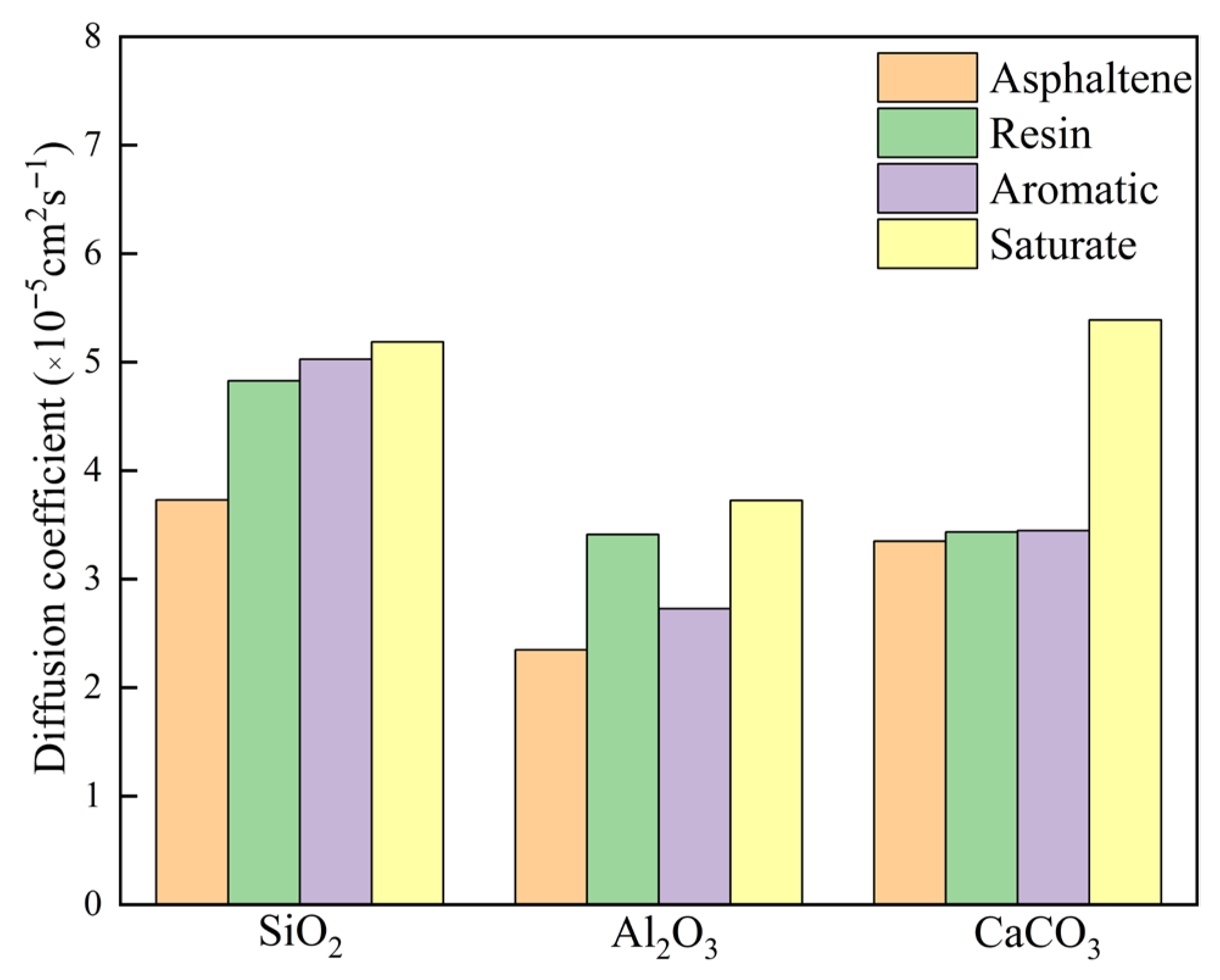 - In terms of asphalt fractions, resin and aromatics were the primary contributors to interfacial adhesion strength due to their notably high concentration and functional groups capable of interacting with aggregate surfaces. Although asphaltenes possessed strong polarity, their contribution remained limited owing to their low concentration and strong aggregation tendency.