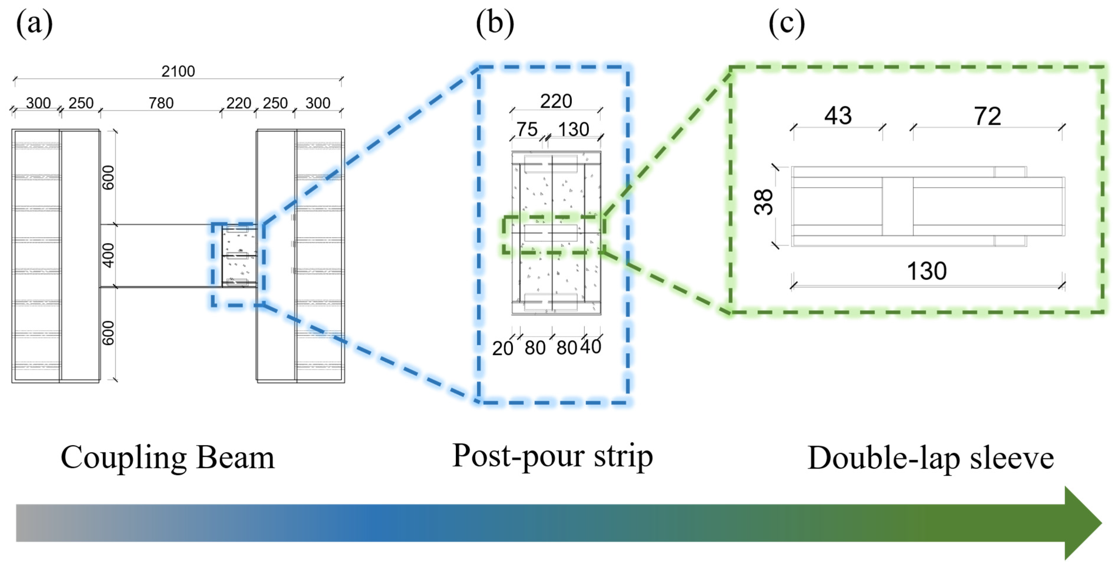 | Specimen | Coupling Beam Dimensions (mm) | Longitudinal Reinforcement | Shear Reinforcement | Span-to-Depth Ratio | Sleeve Connection Detail |