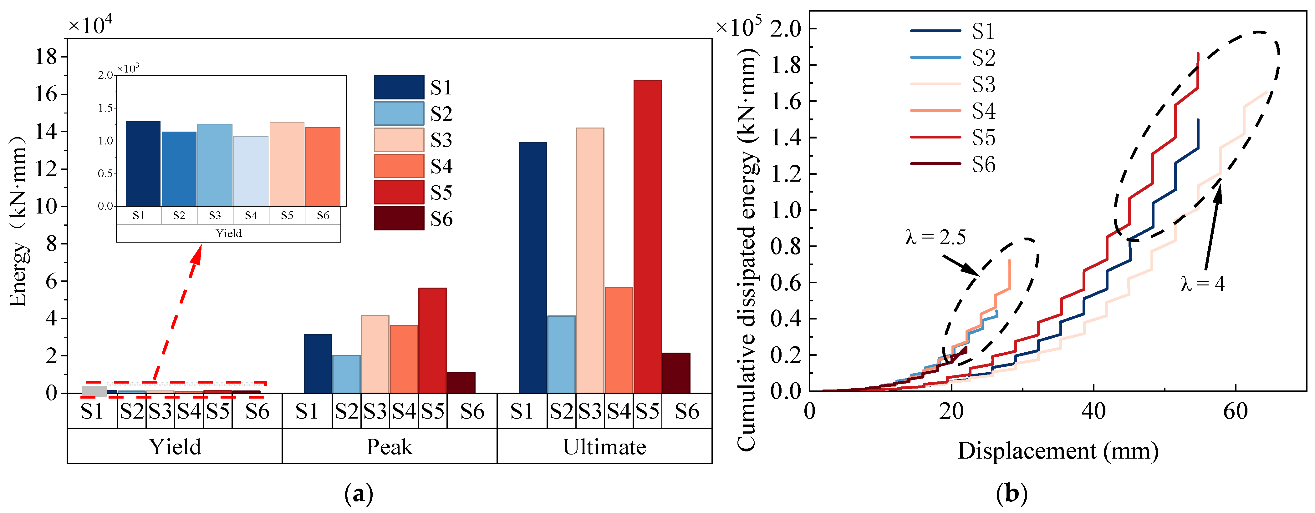 - Liu, R.; Wang, Z.; Yan, G.; Zheng, L.; Chen, Y.; Lu, J.; Jiang, G. Seismic Behavior and Parametric Study of the Precast Shear Wall with Steel Energy-Dissipating Connection. Structures 2025, 82, 110542. [Google Scholar] [CrossRef]