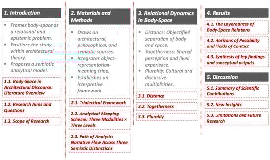 This article is structured into six main sections: Section 1—Introduction, Section 2—Materials and Methods, Section 3—Relational Dynamics in Body–Space, Section 4—Results, Section 5—Discussion and Section 6—Conclusion [Figure 1]. Section 1 outlines the historical and theoretical background of the body–space relation, makes visible the fragmented approaches in the literature, and sets out the research aims, questions, and hypotheses that guide the study. Section 2 presents a threefold analytical framework. This framework aligns Kosuth’s triad of object–image–definition with the syntactic–semantic–pragmatic levels of semiotics and with three relational modalities of the body–space relation [distance, togetherness, plurality]. This trialectic scheme is operationalized through an analytical mapping diagram and a narrative reading path that follow these three semiotic levels.