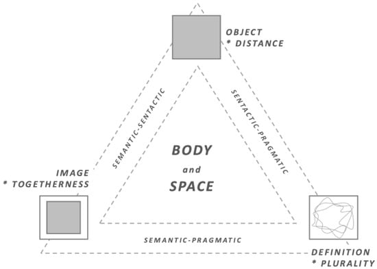 In the second step, the triadic frameworks are operationalized through an analytical mapping scheme. This scheme aligns, on the one hand, the relational modalities [distance–togetherness–plurality] and, on the other, the semiotic distinction [syntactic–semantic–pragmatic] and the order of representation [object–image–definition]. In doing so, it renders the body–space relation readable through a single representational dispositif, across three modalities of relationality and three levels of meaning.