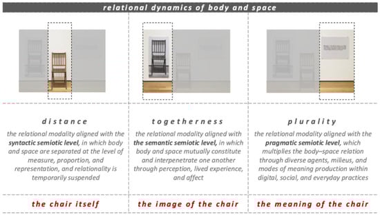 The analysis suggests four main conclusions. First, traditional geometric and object-centered approaches largely operate within the axis of distance and at the syntactic level, treating the body as a measurable unit and space as a neutral container. Second, phenomenological and experiential accounts move the focus towards togetherness and the semantic level, where body and space become mutually constitutive through perception and lived experience. Third, contemporary plural and more than human perspectives push the discussion towards the axis of plurality and the pragmatic level, where bodies, environments, and technologies form open ended assemblages rather than stable pairs. Fourth, Kosuth’s “One and Three Chairs” provides a model that allows these shifts between axes and levels to be read as systematic reconfigurations of object, image, and definition.