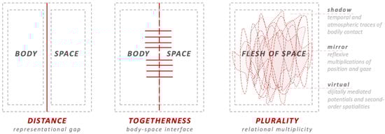 - Relational modalities [distance–togetherness–plurality]: organizes bodily–spatial encounters along three interpretive axes: distance, which emphasizes separation grounded in measure and form; togetherness, which describes perceptual and affective proximity; and plurality, which indicates relational patterns that proliferate through practices and discourses.