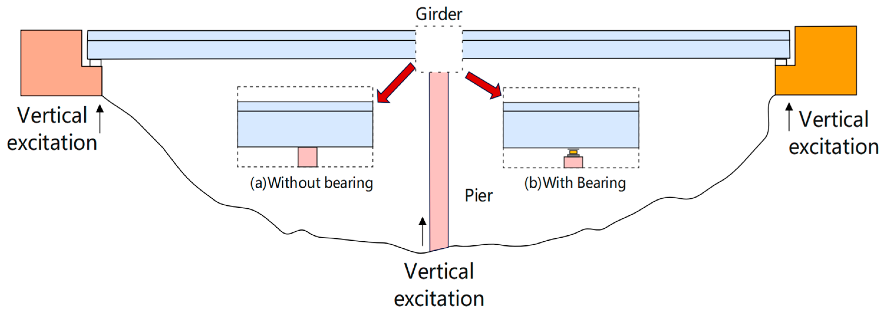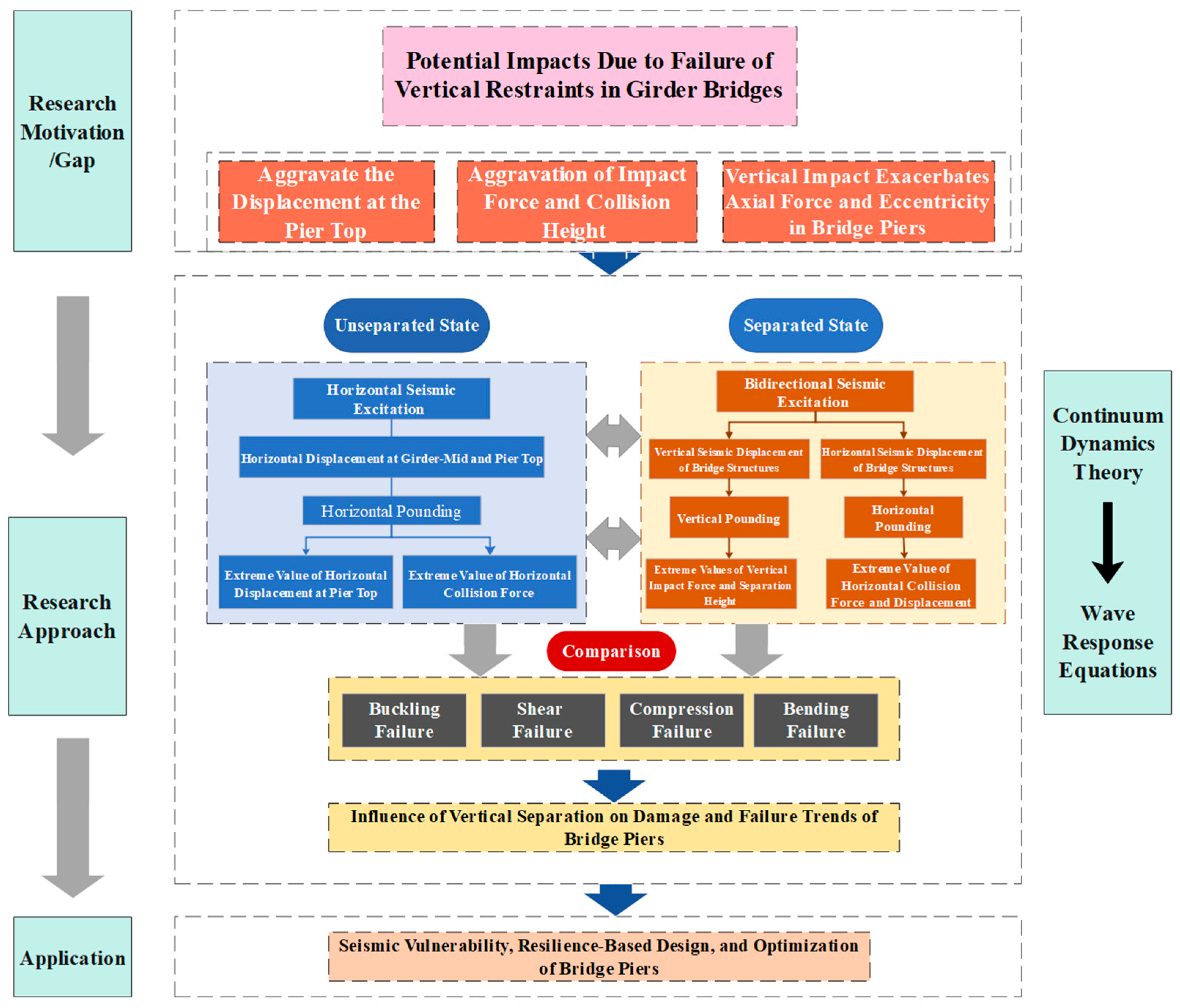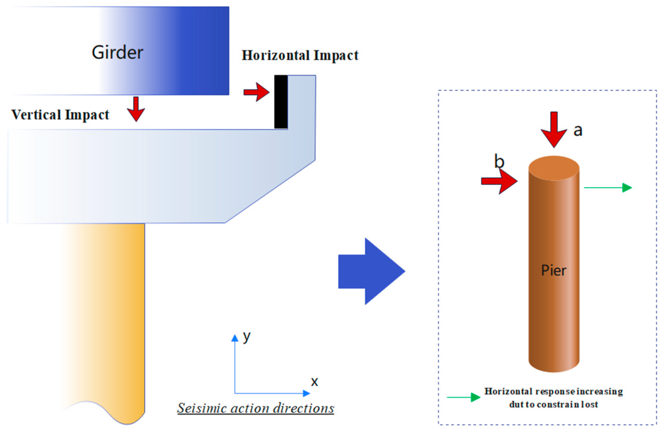 - Current research endeavors concerning vertical seismic effects predominantly focus on validating separation phenomena and conducting preliminary exploration into failure mechanisms, while giving scant consideration to the secondary hazards stemming from vertical separation. As previously discussed, the girder–bearing separation phenomenon in girder bridges significantly intensifies the impact forces and exacerbates both horizontal and vertical load requirements on piers, thereby substantially elevating collapse risks (Figure 14). This critical issue has, thus far, failed to garner adequate attention. Notably, girder bridges have emerged as the dominant selection for small-to-medium span highway bridges, attributable to their structural simplicity, rapid construction process, and high degree of standardization. Nevertheless, these inherent structural attributes also render them particularly vulnerable to seismic-related challenges, necessitating urgent and focused research efforts.