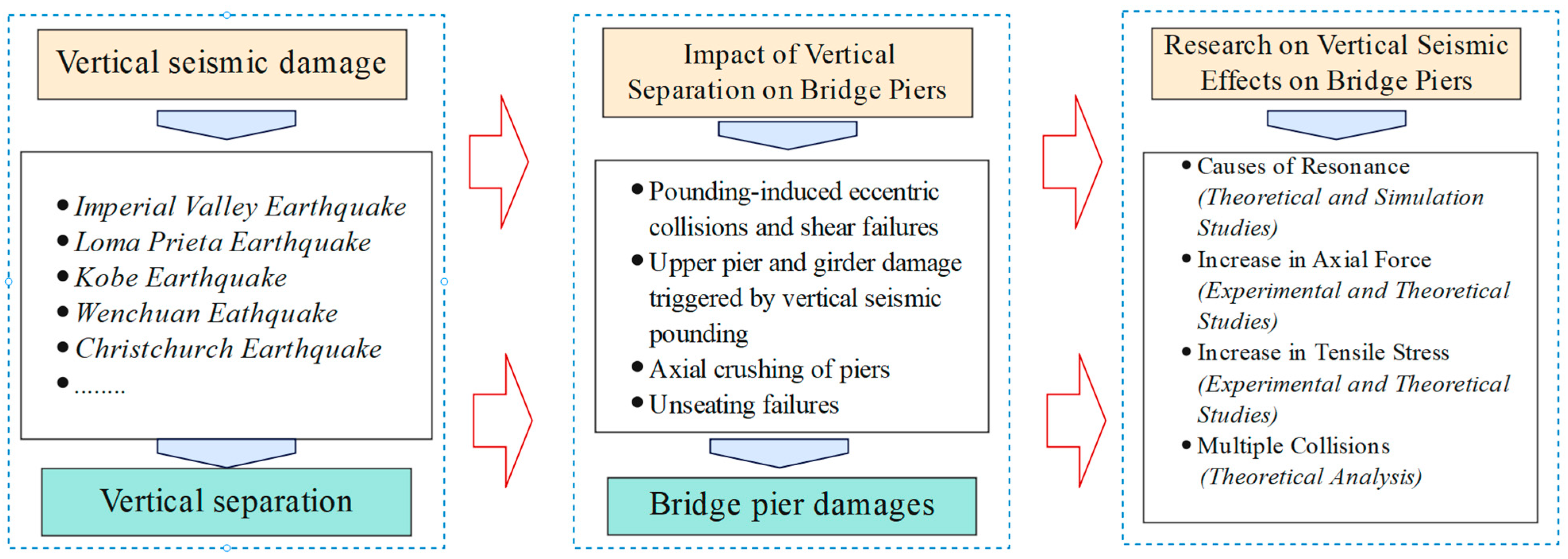 - Existing research endeavors have unveiled a spectrum of impacts induced by vertical earthquakes, which primarily encompass the following aspects: (1) eccentric collisions and shear failures; (2) upper pier damage triggered by pounding; (3) pier crushing; (4) unseating failures due to weakened girder–bearing contact; (5) bridge collapse scenarios. These seismic damages primarily originate from the displacement amplification and intensified collisions exacerbated by diminished contact between girders and piers under vertical excitation. Studies provide mechanistic elucidation for these phenomena, thereby deepening the comprehension of bridge responses under vertical earthquakes and furnishing scientific foundations for seismic design and assessment.