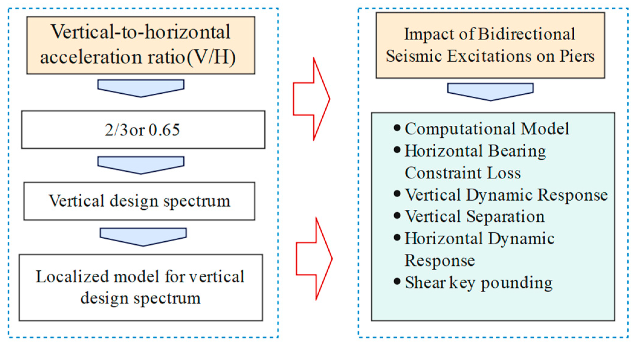 - In investigating the effects of coupled horizontal–vertical seismic actions on structures, the V/H serves as a critical parameter. Current research consensus confirms that the V/H ratio exhibits strong correlations with multiple factors, including site conditions, excitation periods, and focal depths. Consequently, adopting a fixed V/H ratio (e.g., 2/3 or 65%) may inadequately represent actual seismic scenarios, revealing methodological limitations in current approaches. Advances in seismic monitoring technologies and expanded datasets have enabled the development of dynamic V/H ratio prediction models, which significantly improve the accuracy of structural response simulations under multi-directional seismic actions. Both theoretical and experimental analyses demonstrate that bridge piers subjected to coupled horizontal–vertical excitations may experience significantly more severe damage compared to unidirectional seismic inputs. This coupling effect manifests through increased displacement demands and amplified curvature ductility requirements, exacerbating structural damage during actual earthquakes. To improve the safety and reliability of bridge structures under seismic events, it is imperative to deepen investigations into coupled horizontal–vertical seismic influences and systematically incorporate dynamic V/H ratio variations and coupling effects into design frameworks.