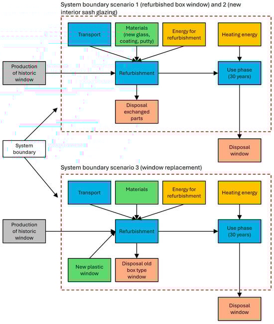 The functional unit of this study is the lighting and ventilation of a room through a window (frame exterior dimensions: 101 cm × 183 cm) over a life span of 30 years. The system boundaries of this LCA include the manufacturing and construction phases (production of all materials used, energy demand with heat loss over the window included, transport), and the usage phase (energy demand for space heating) but not the disposal phase of the renovated or replaced window in the future. Figure 4 provides a graphical representation of the system boundaries for the three scenarios under investigation.
