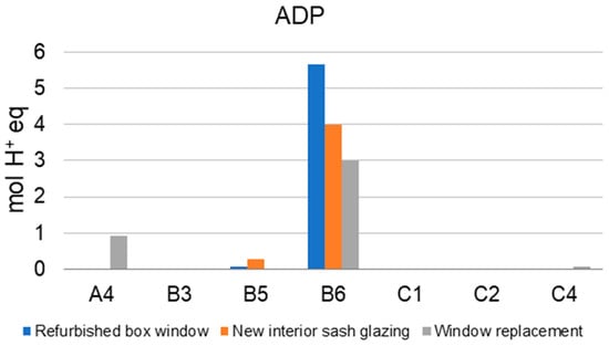 The majority of the environmental impacts in the impact category of acidification are caused by the energy demand for space heating (B6), particularly the energy production from biomass (Figure 7). Since this is the highest in the scenario of the refurbished sash window, this scenario performs the worst in comparison. In the window replacement scenario, the energy consumption for space heating is the lowest, which is why this scenario achieves the best results for acidification. In the manufacturing phase (A4), the window replacement scenario results in the highest environmental impacts. This is due to the environmental impacts associated with the production and transport of the new plastic window. In the life cycle phase of renovation/renewal (B5), the environmental impacts of the renewed interior sash glazing are the highest. This is due to the energy and material inputs (including glass panes, linseed oil paint, putty, and seals).