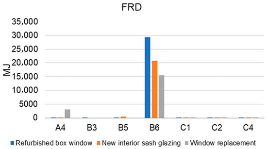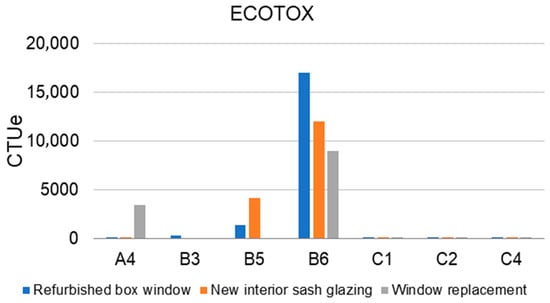 Across all three scenarios, the energy demand associated with space heating (B6) represents the primary contributor to freshwater ecotoxicity (Figure 9). The predominant share of this impact stems from energy production based on fossil oil. As the scenario involving the refurbished box-type window exhibits the highest energy consumption for space heating, it consequently results in the most adverse ecotoxicity outcomes. In contrast, the window replacement scenario demonstrates the most favourable performance in this regard.