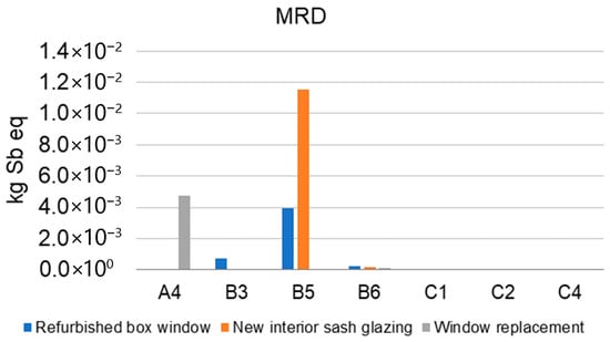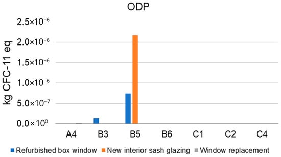 During the production phase (A4), the window replacement scenario incurs the greatest environmental burdens, primarily due to the manufacturing and transportation processes of the new PVC window unit. Furthermore, owing to the material and energy inputs required for the renovation activities, the scenario involving the installation of new interior sashes registers the highest environmental impacts when compared across scenarios. The end-of-life phase contributes negligibly to the overall environmental impact within this specific impact category.