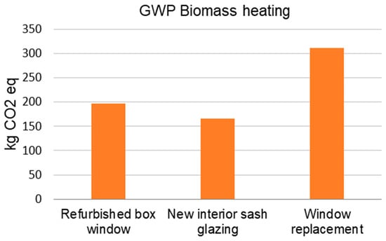 Lowest GWP for refurbished window with low-e interior sash glazing and heating energy supplied entirely from biomass.