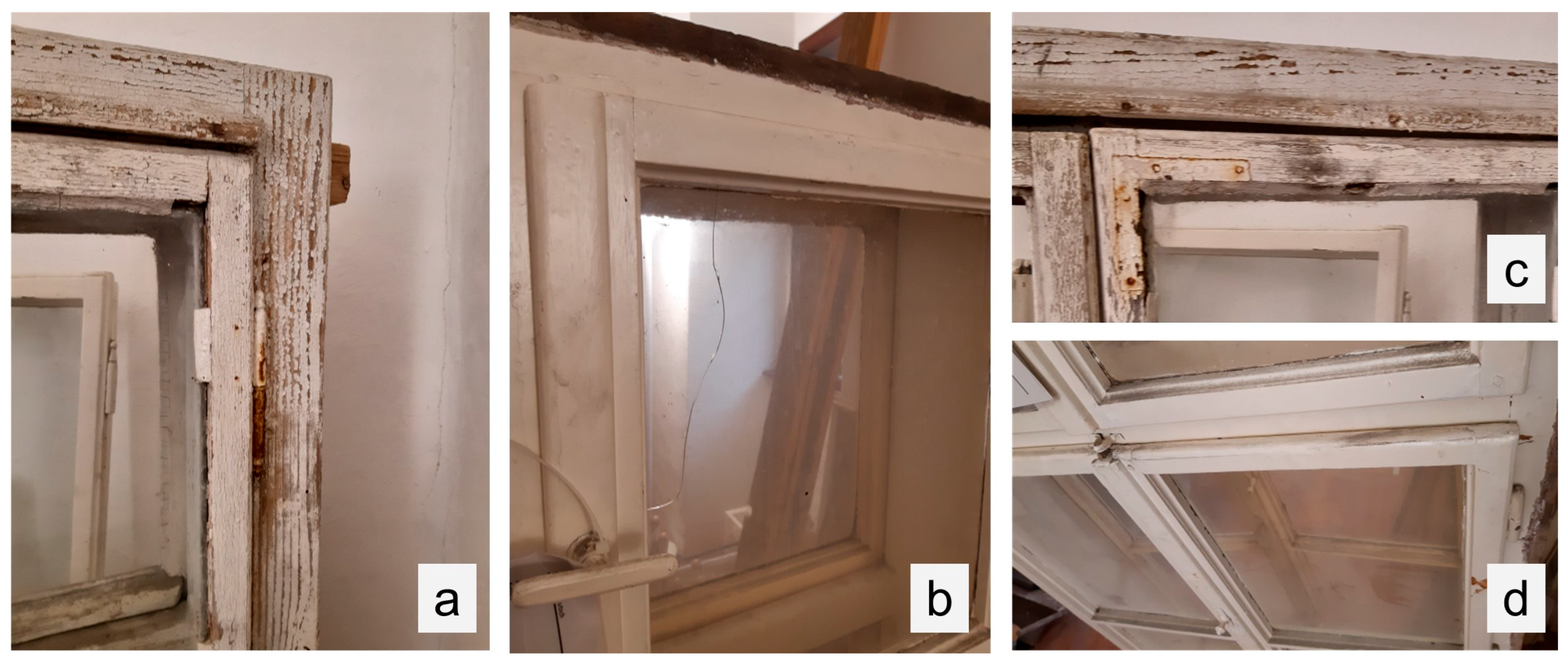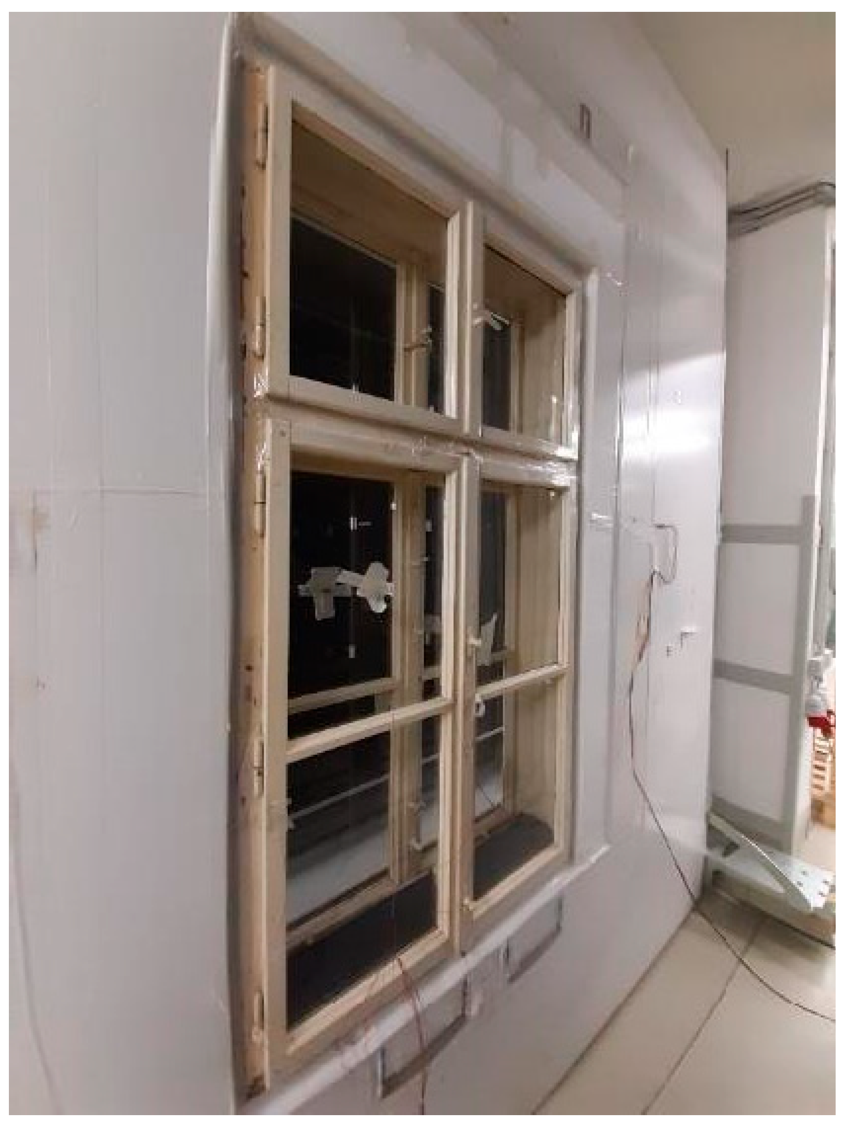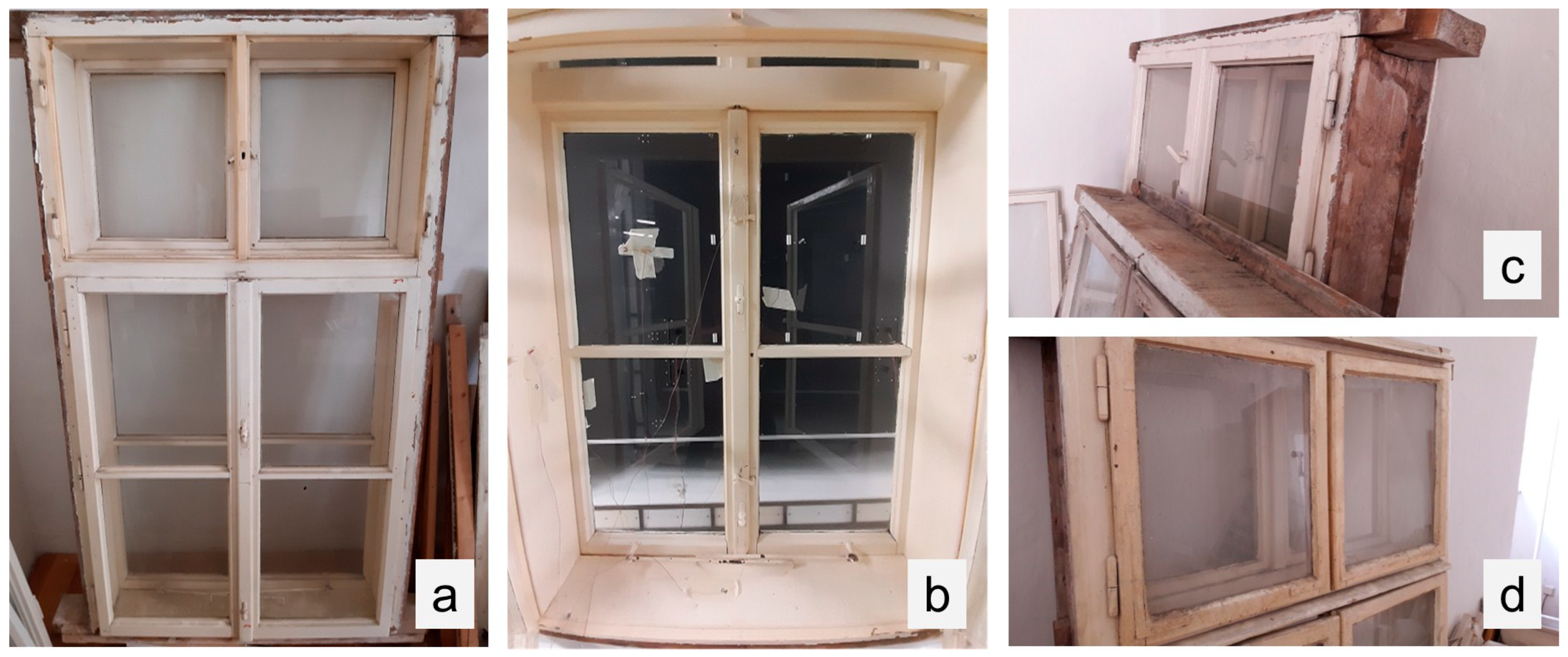 - Bichlmair, S.; Krus, M.; Milch, C. Energetische Fenstersanierung im Altbau und Denkmal—Hygrothermische Aspekte am Kastenfenster. In Denkmal und Energie 2021; Weller, B., Scheuring, L., Eds.; Springer Fachmedien Wiesbaden: Wiesbaden, Germany, 2021; pp. 205–217. ISBN 978-3-658-32247-2. [Google Scholar]
