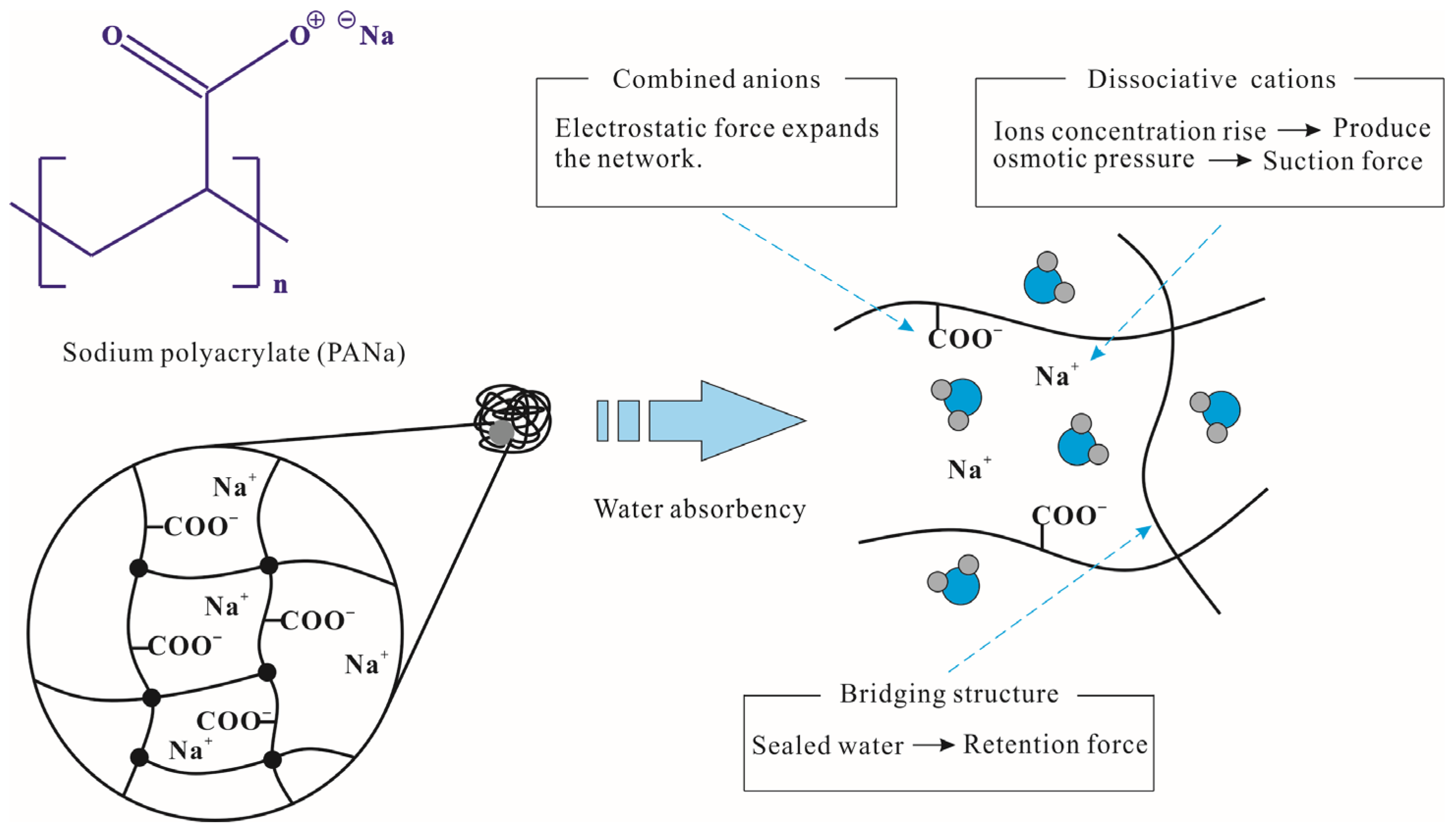 - Mignon, A.; De Belie, N.; Dubruel, P.; Van Vlierberghe, S. Superabsorbent polymers: A review on the characteristics and applications of synthetic, polysaccharide-based, semi-synthetic and ‘smart’ derivatives. Eur. Polym. J. 2019, 117, 165–178. [Google Scholar] [CrossRef]
