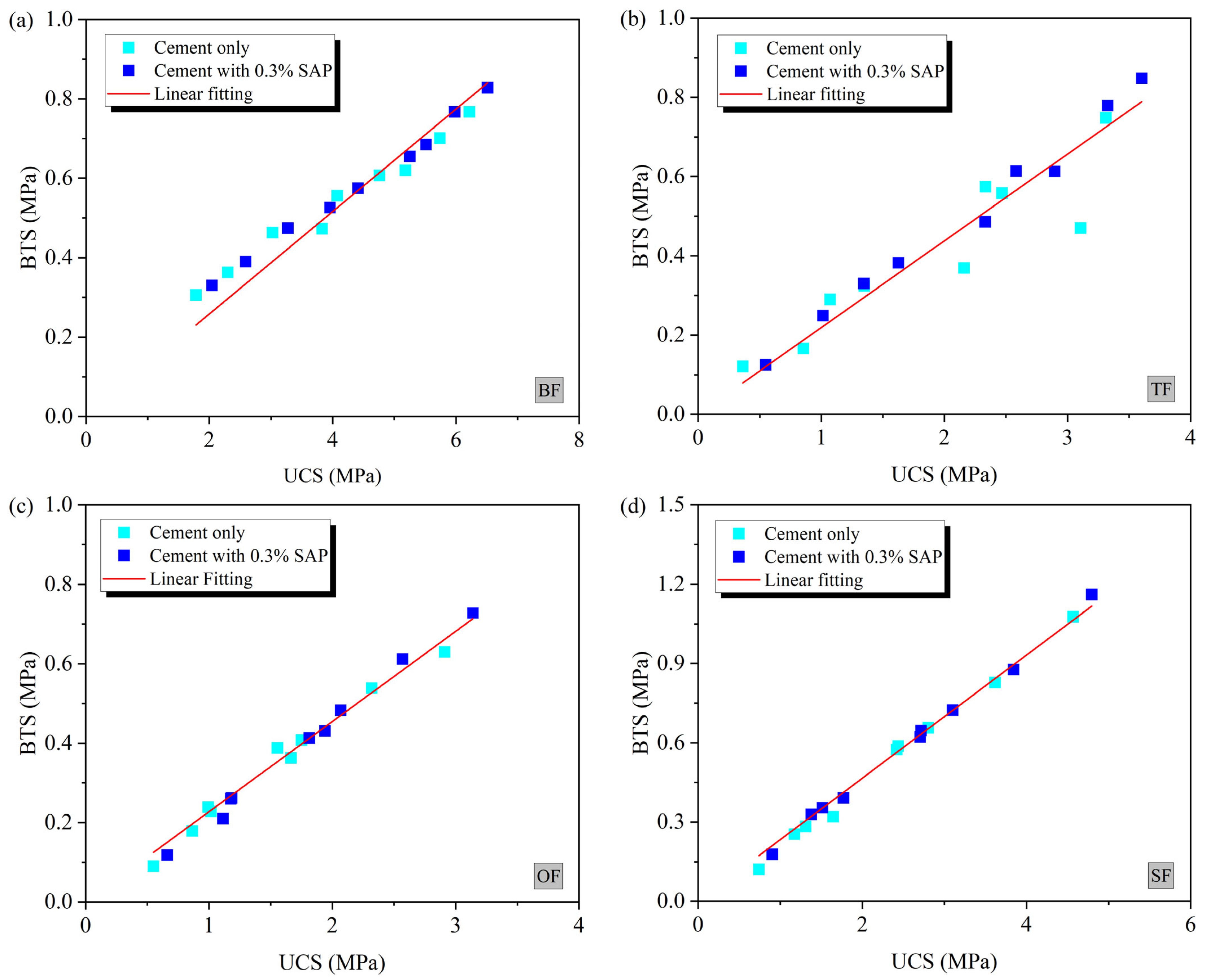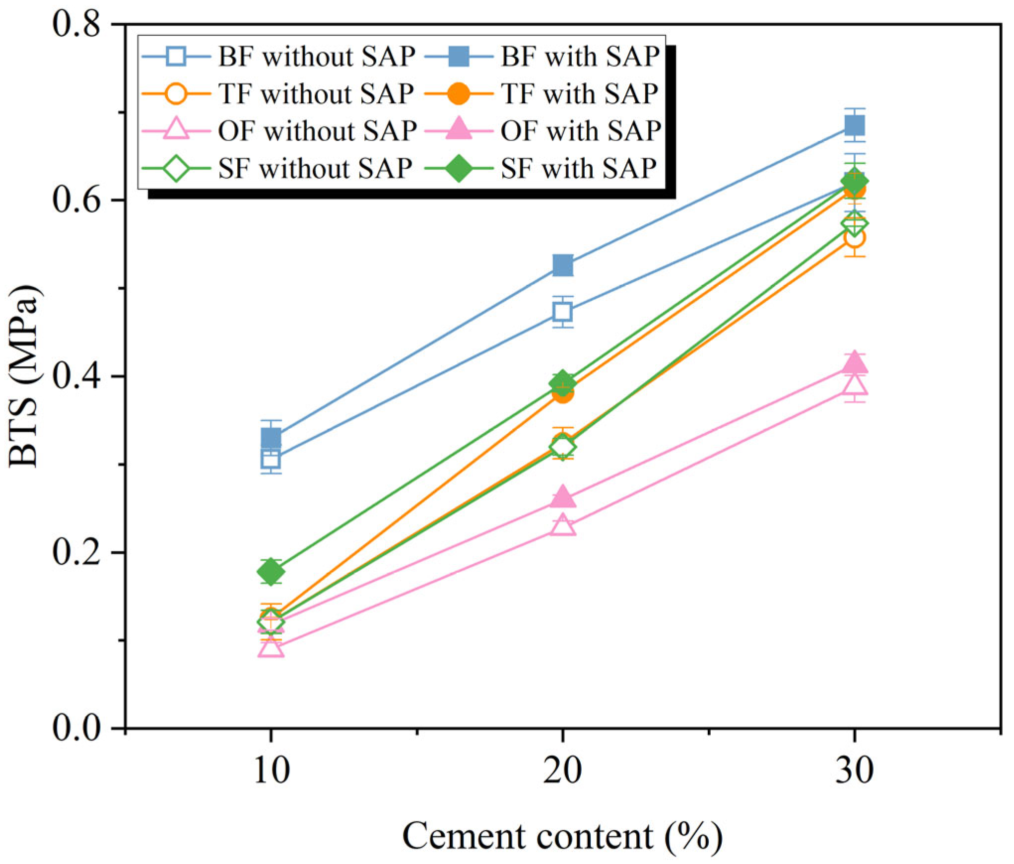 - The addition of SAP (Superabsorbent Polymer) acts as an effective performance optimizer, with its efficacy being highly dependent on both cement content and curing period. At lower cement contents, the effect of SAP is limited or slightly adverse, as its water absorption may introduce structural discontinuities within the weakly cemented matrix. At higher cement contents and with an extended curing period, SAP consistently enhances BTS. This underscores the role of SAP’s internal curing in facilitating long-term, uniform hydration and microstructural optimization.