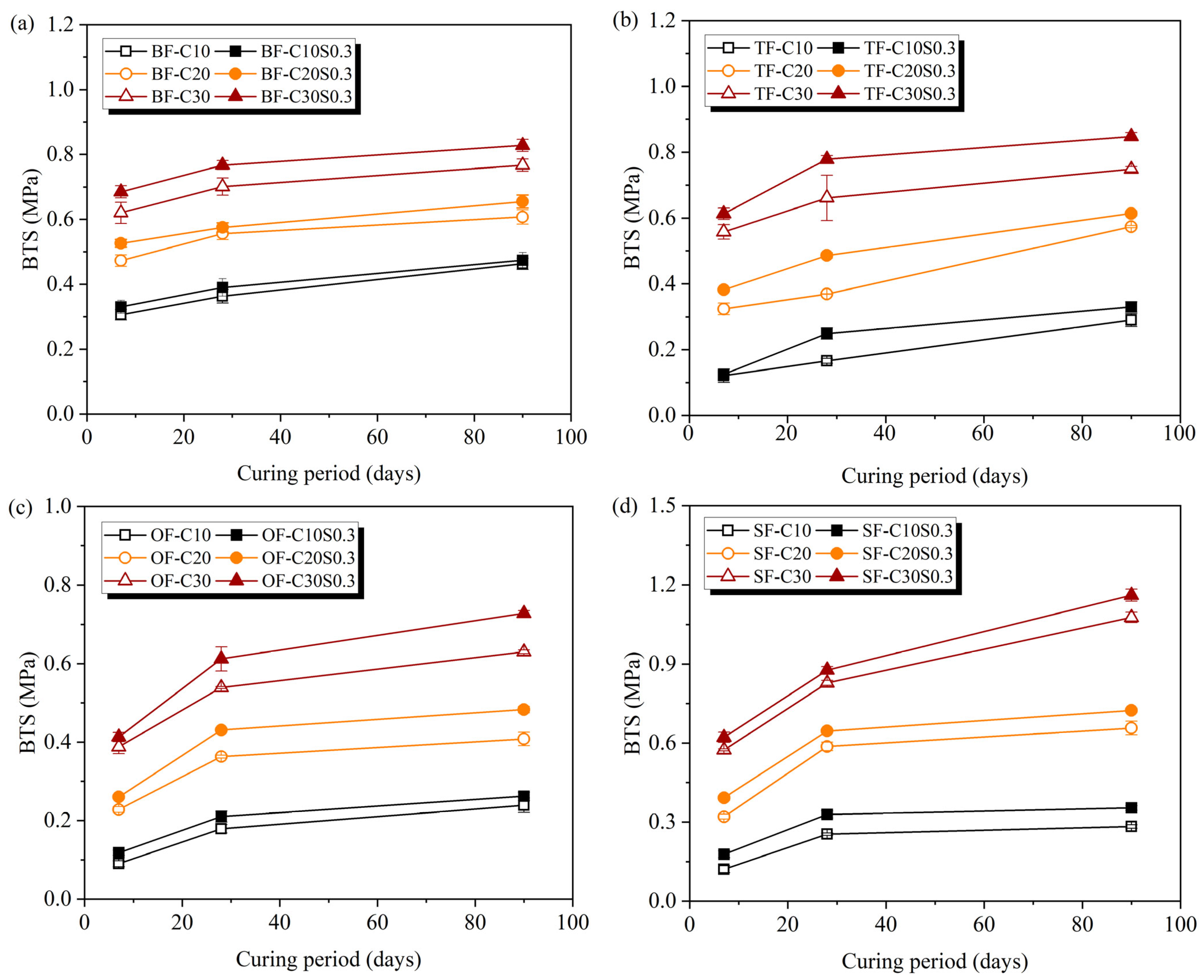 - The incorporation of cement is the primary factor governing the strength development of stabilized clayey soils. The BTS increases significantly and near-linearly with rising cement content and with an extending curing period, which is attributed to the progressive formation of cementitious hydrates that enhance the soil’s matrix integrity.