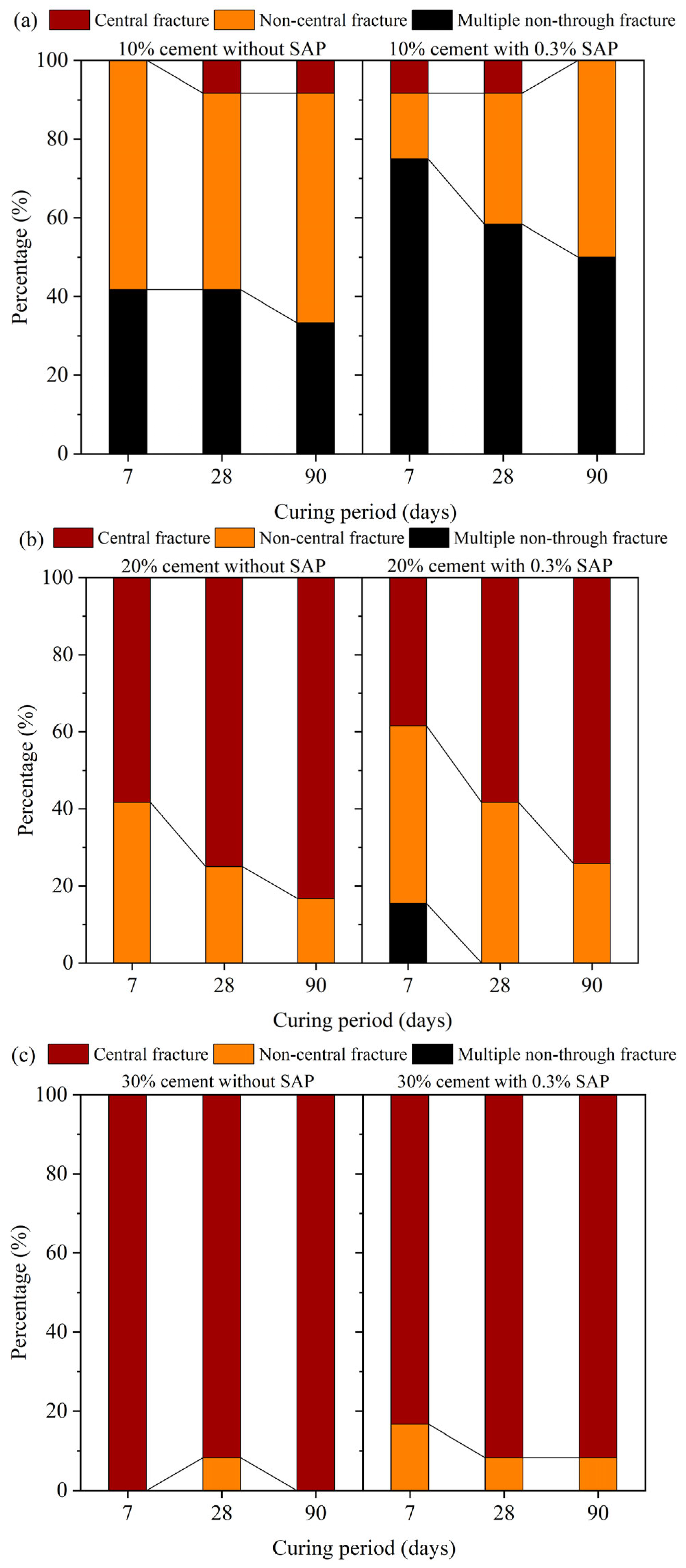 - Failure mode evolution is a direct indicator of internal structural improvement. As the cement content increases, the curing period extends, and upon the SAP addition (when cement is sufficient), the failure mode shifts systematically from multiple non-through fracture to central fracture. The transformation is directly related to enhanced internal homogeneity and reduced internal defects within the stabilized clayey soils.