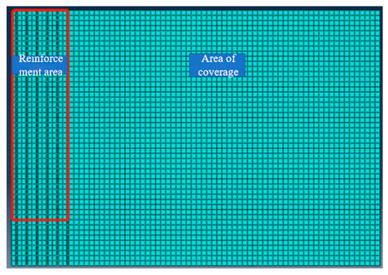 A 2-D axisymmetric model was adopted, representing a cylindrical domain around a single prefabricated vertical drain (PVD). Consequently, only half of the domain was discretized to improve computational efficiency. The mesh spans 36 m in radius (horizontal direction) and 25 m in depth (vertical direction), as shown in Figure 1. This comprises a 6 m radius treatment zone (where the PVDs and air-bag are installed) surrounded by a 30 m wide influence zone. The lateral extent of 30 m was determined through preliminary analyses to ensure that the fixed side boundaries (restrained in the X-direction) do not artificially constrain horizontal displacements, as the deformation and pore pressure changes near these boundaries were negligible.