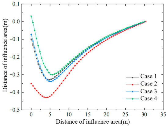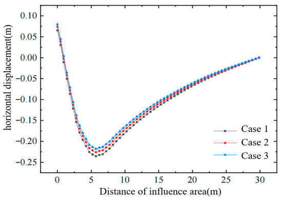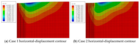 Figure 3 presents the horizontal-displacement contours for Cases 1 and 2 after improvement. Where the air-bag pressure is applied, the inward (negative) horizontal displacements in both the improved zone and the affected area are markedly smaller than those induced by vacuum alone; the reduction is most pronounced at the depth where the air bag is installed. This demonstrates that the lateral expansion generated by the air-bag pressure counteracts part of the inward vacuum-induced contraction, decreasing the inward horizontal displacement by more than 20% in the interval where the maximum negative displacement occurs. Consequently, when lateral deformation of the affected soil must be controlled, the combined vacuum–air-bag system can be adopted to achieve simultaneous ground improvement and restraint of lateral movement.