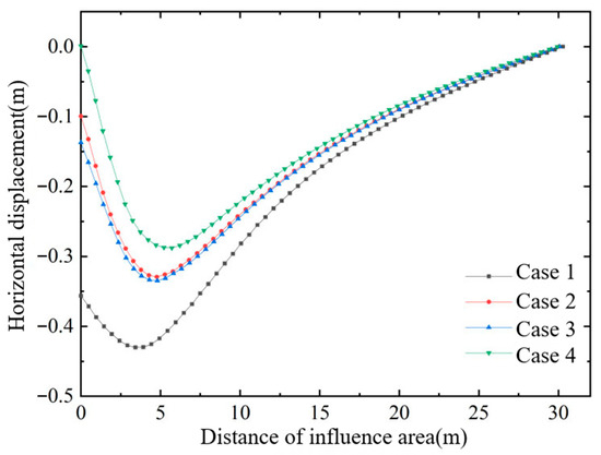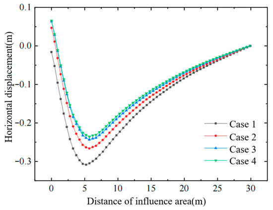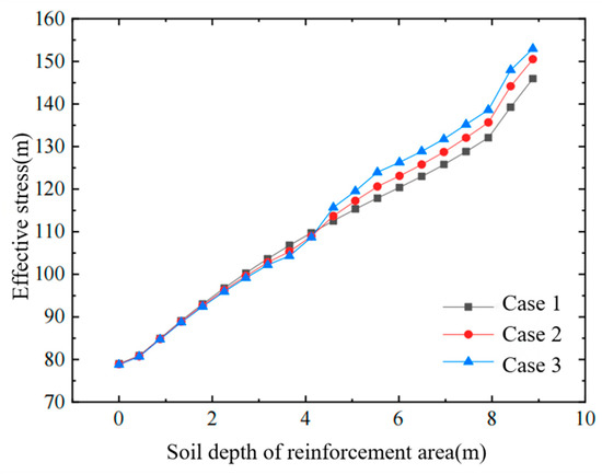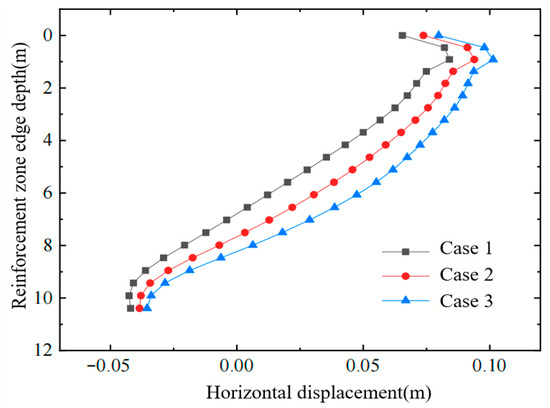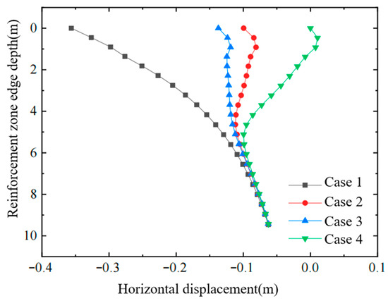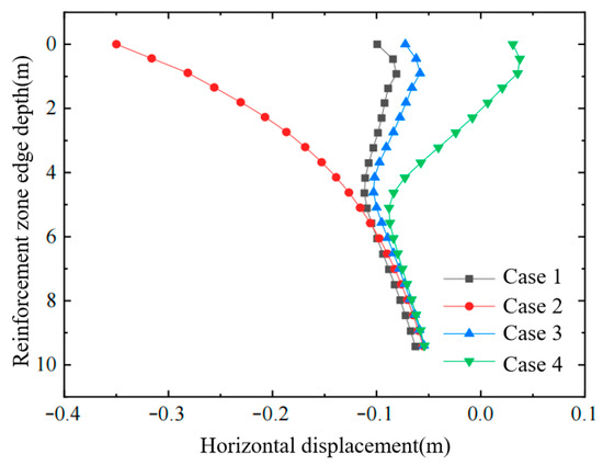 Figure 4, Figure 5 and Figure 6 show, respectively, the variation in horizontal displacement with depth at the edge of the improved zone, the variation in horizontal displacement with distance in the surface layer of the affected area, and the variation in effective stress with depth inside the improved zone. From these plots, the following conclusions can be drawn: