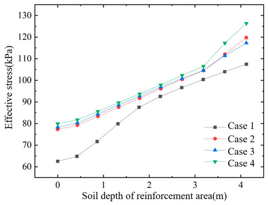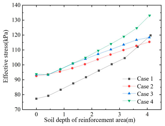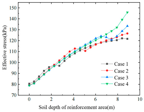 Figure 11, Figure 12 and Figure 13 show, respectively, (i) horizontal displacement versus depth at the edge of the improved zone, (ii) horizontal displacement versus lateral distance in the influence zone, and (iii) effective stress versus depth inside the improved zone, all after treatment with different stepped air-bag pressurization schemes. From these figures, the following conclusions can be drawn: