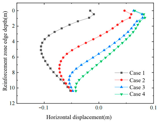 Lateral displacement of a soil layer results from the cumulative movement of that layer and all underlying strata. To quantify how air-bag embedment depth affects post-improvement lateral deformation and effective stress, four numerical cases with different bag depths were analyzed; the details are listed in Table 3.