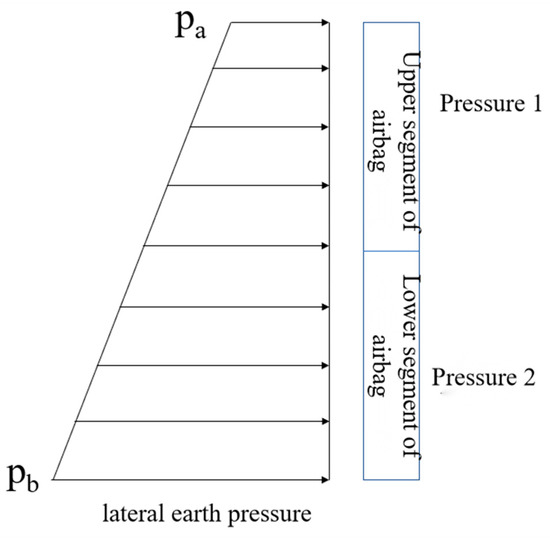 Since lateral earth pressure increases with depth, the air-bag becomes better constrained at greater depths; consequently, the pressure can be appropriately enlarged below a certain elevation to enhance the improvement of the deeper soil and further reduce its lateral displacement. A stepped pressurization scheme—lower pressure in the upper part and higher pressure in the lower part—is adopted, as illustrated in Figure 10. The specific working conditions are shown in Table 4.